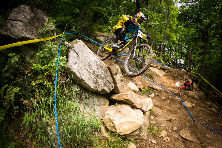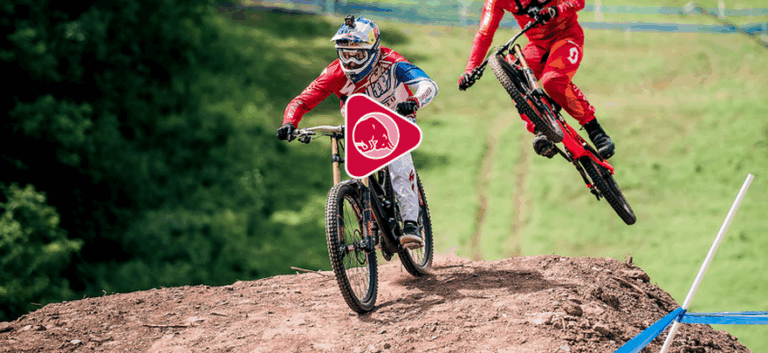 Claudio Caluori and Aaron Gwin ride Windham World Cup track.