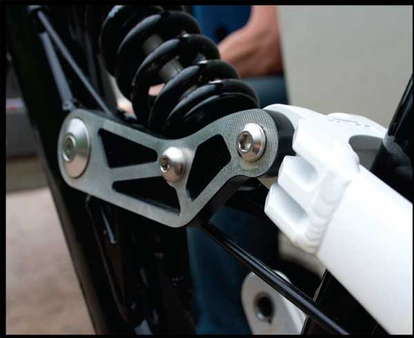 The Tribute is one of a number of European bikes using the Horst link – a well–proven bicycle suspension design. Horst Leitner once worked for KTM on the motocross suspension design before emigrating to America and selling one of his designs to Specialized, which they still use today. The PDS (Pro Damping System) on the Tribute is as featured on motocross bikes and was developed by KTM in the seventies – the system seen here on the Tribute is essentially a four bar design pivoting on the chainstay.
