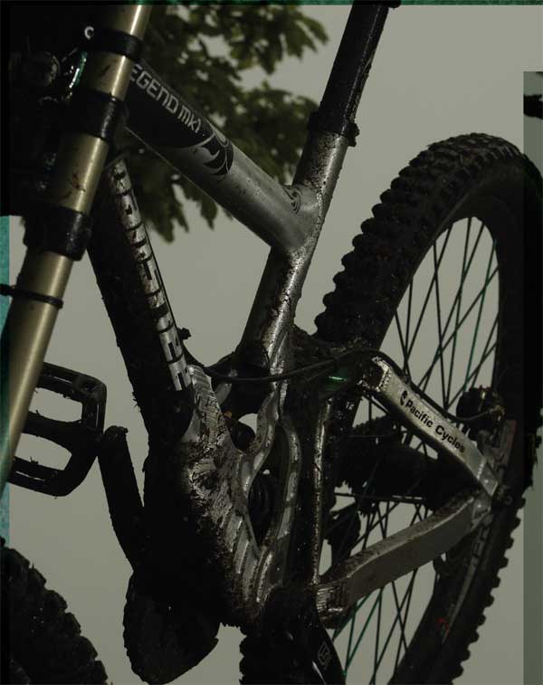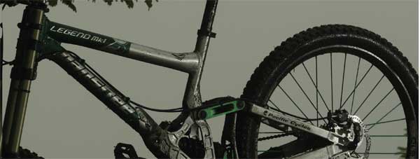 The Legend is all about speed, after all that is what DH racing is all about. The frame and linkage has been optimized for speed. It is a pure race machine, with slack geometry and very low centre of gravity (CoG). I wanted a big travel frame that was lightweight and pedalled like a shorter travel bike, but could take the hits? The initially rearward axle path is designed to give the bike stability at speed and to suck up the small square edge bumps. There are a lot of decent DH race bikes out there, but a lot of them feel quite dead to ride I have found. Not only is the Legend fast to ride, it is also lively and fun. Cornering is all–important in DH racing, as the racers out there will testify. If you can go round, and most importantly exit, a corner with speed, then you carry that speed the whole way through the next section. The heaviest element of a DH frame is always the rear shock, so I designed the frame to position the shock as low in the frame as possible, whilst still protecting from mud and rocks. Obviously it is combined CoG of the rider and bike that matters, so a low BB is a must. A low CoG makes cornering easier and a bike more stable, which gives the rider more confidence to push their limits.
