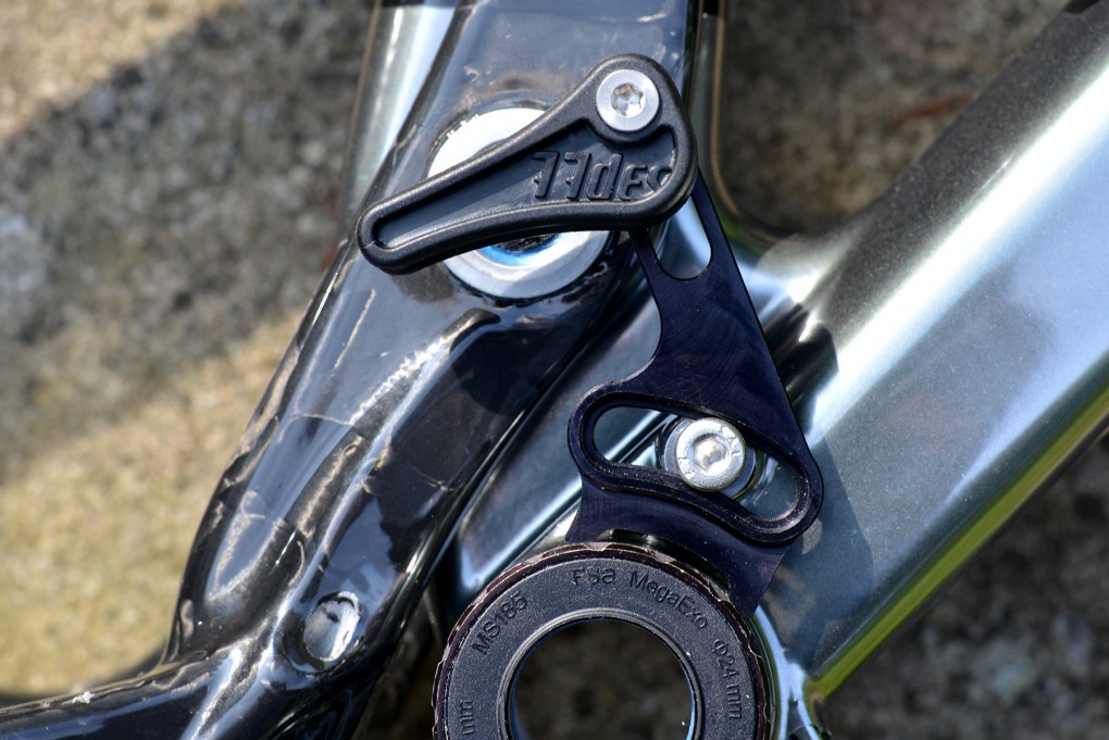 Part of the reason why 77 Designz have been able to make this so light is because they’ve come up with a unique (as far as we know) one-bolt design. Normally if you mounted a chainguide like this to just one of the ISCG bolts the whole thing would rotate of its own accord, but as you can see in the photo above this chainguide has little prongs at the bottom that make contact with your bottom cup, and therefore stop any rotation. Simple, but clever. Of course this only works if you have a conventional bottom bracket (both ISCG 05 and original ISCG are catered for), but fear not if you have a press fit bottom bracket because 77 Designz are also offering a two-bolt version for such situations, and at 27g it only weighs a little more. One that mounts to a high direct front mech mount is in the pipeline too, and if you want some bash protection then 77 Designz also produce a neat little ‘taco’ that attaches to the two remaining ISCG tabs. One of those will set you back £26.78 (weird pricing is due to exchange rates), and weighs just 37g.