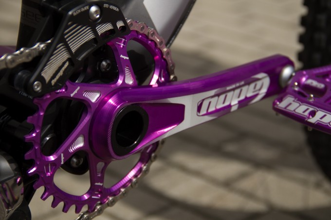 Aside from being some tidy looking cranks they feature a unique axle/crank arm interface that has been developed to run with most combinations of bottom brackets and chainring setups. You can run Hope’s new spline mounted chainrings or use a single ring with the ability to accommodate a bash guard.