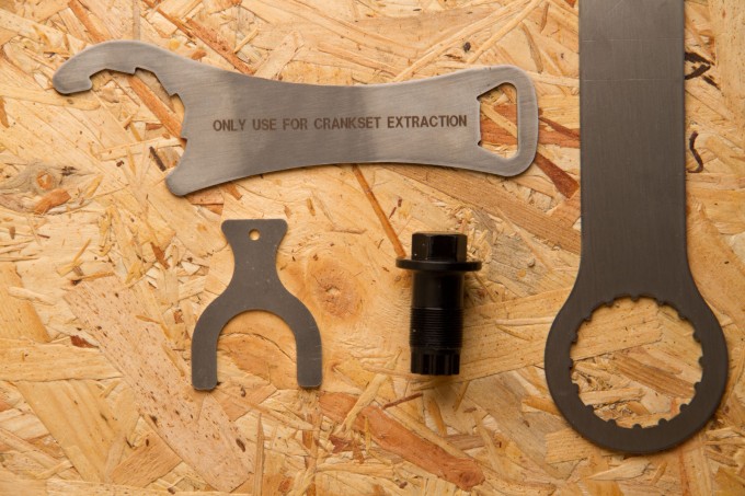 The clever thing about this system is that it allows for wear and should in turn add longevity to this investment. We haven’t experienced this problem very often but if cranks become slightly loose the splines inside the crank can wear, once they have no matter how tight you do up the external bolt they will still be loose. The combination of the expanding axle and ramped ends to the axle splines means that if things get worn you can loosen everything off re-tighten and they should be as good as new. We will have to give them a lot of testing to prove this works but the principle seems sound and Hope must think it is to have applied for a patent on it. Crank removal is a simple affair, engaging the lockring with the flat wishbone shaped tool between that and the bottom bracket. Winding the locking against the tool lifts the crank off the axle and the drive side can be removed.