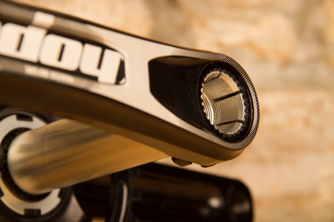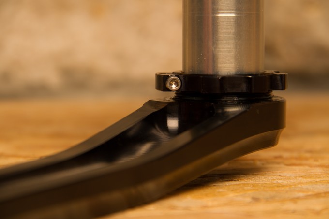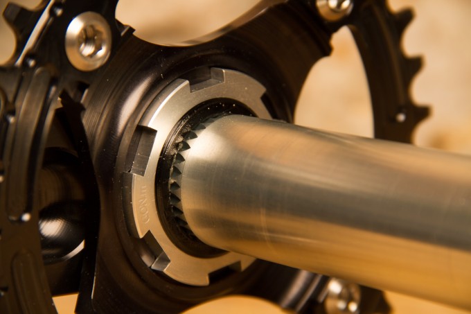 The first thing that stands out is the cuts through the splined end of the axle, the purpose of that will be come clear but at the inside end of the splines are small ramps that the arms tighten against. With the cranks pushed through the bottom bracket the non drive side arm slots onto the axle with a reassuringly tight tolerance and the threaded collar, that works in a similar way to previous XTR cranks, wound back as close to the crank as it goes.