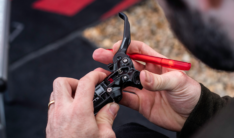 When it comes to slowing down a bike the brakes we often choose are from the SRAM brand. Whether on a trail bike or a gravity orientated DH machine their stoppers have given a blend of power and modulation with the brake lever mounts nicely integrating with SRAM shifters and Reverb lever. The days of unreliability and inconsistent feel of the early Avid brakes are long behind us now – these brakes are packed with SRAM’s latest technology and refinements. With their ‘Bleeding edge’ bleed system maintenance is very clean and straightforward. The Avid Code brake is now a good few seasons old, so SRAM have given this four-pot brake a full redesign. We’ve always loved the combination of a Guide lever on a Code caliper, and with the impressive performance of the Guide RE brake on e-mtbs we feel that this new DH brake will be an impressive piece of hardware.