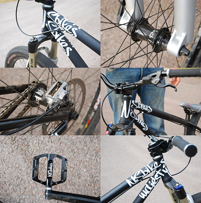 We’ll be having a full test on this bike (and a load of others) in an upcoming issue of the mag, but I‘ll just give you a quick run down on some of the key products. We went for the complete NS finishing package of bars, stem, pedals and hubs (the front hub comes with no disc mounts, so back brake only). Sun Ringle rims are bombproof, Intense Micro Knobbly tyres are rulers, integrated headset, some classic Gusset Reynolds 853 cranks we had in the office, an old Charge DJ saddle and Truvativ post, half link chain, a pretty old XTR disc brake and Charge grips.