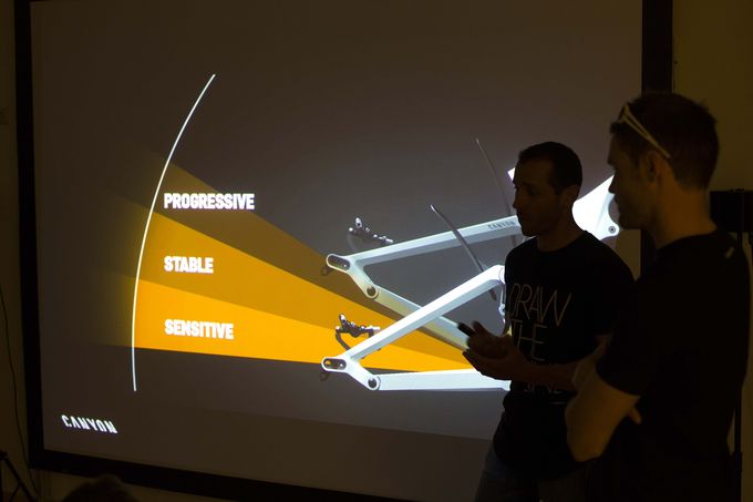 The three stage compression curve of the Canyon Sender is pretty basic stuff, a supple beginning, stable mid stroke and progressive ending to the bike’s suspension. Lead engineer Vincent Thoma talked in depth about the philosophy of the leverage curve, the bike’s high leverage beginning, lower leverage middle and a progressive ending that is reached by the progressivity of the air shock. Thoma went onto point out that “the progression balance is the most important aspect of the bike” and emphasised that the Sender was not designed around a coil because there was “not enough progressivity at the end of the travel”. The press pack showed the bike with an Ohlins which was kind of confusing. But let’s be fully clear what Canyon are saying herein terms of Kinematics.