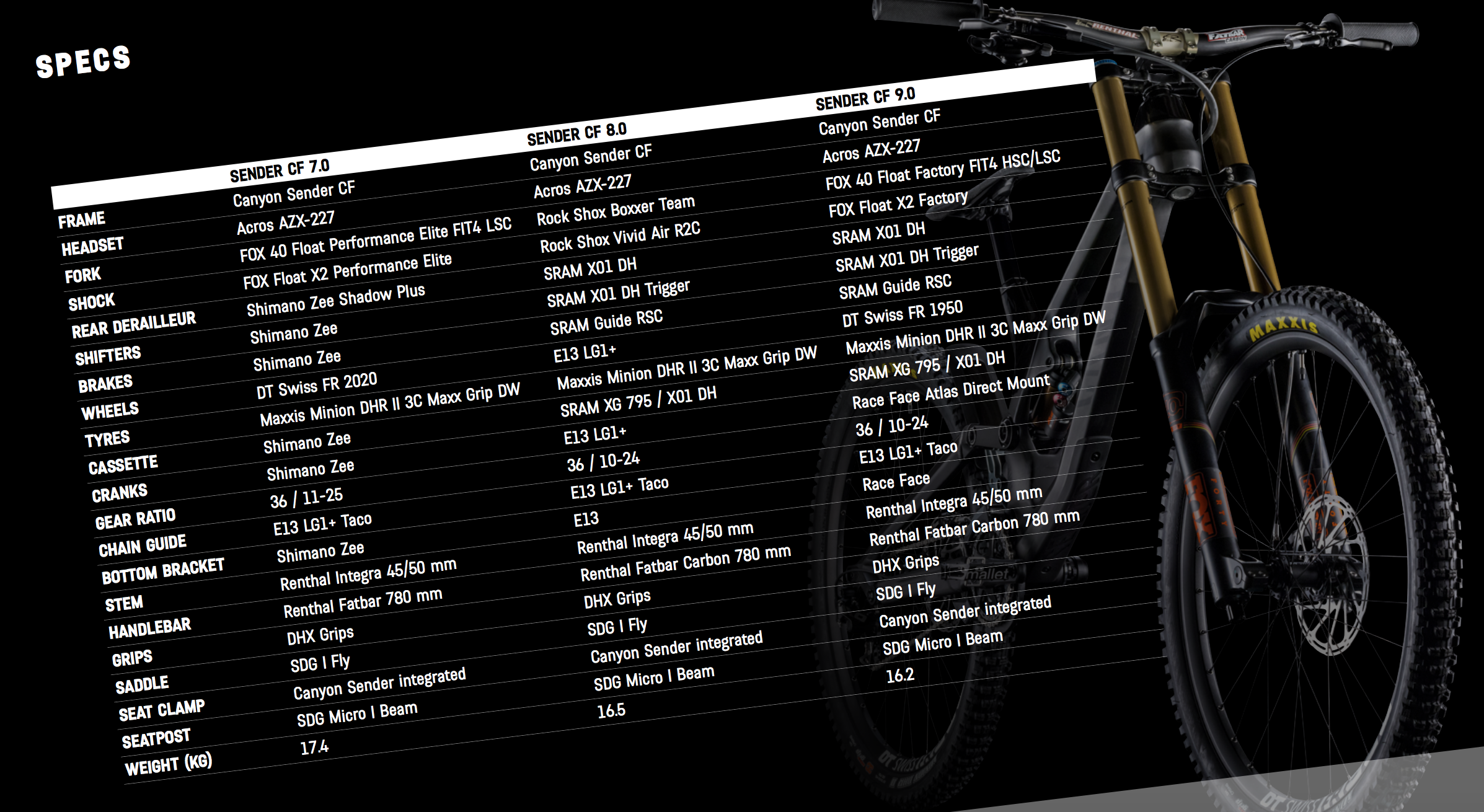 Feeling. The pace of the Sender is immediately apparent and this alone puts it into the higher end of our downhill bike ratings. And the geometry is simply sparkling. But its when you add in a crazy lightweight (about 35lbs) and almost silent ride characteristic you quickly begin to realise that Canyon have not only built a very good bike but one which sends an upper cut to nearly all production downhill bikes. Initial thoughts are that the bike is certainly top five material.