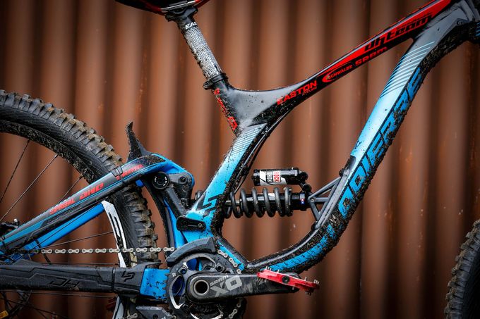 With a bottom bracket of 360mm, wheelbase at 1223mm and head angle of what we measured close to 65 degrees it’s one of the shortest, highest, steepest size large downhill bikes on the market. Now some of those figures taken in isolation are similar to other production size large bikes, for example the wheelbase is actually close to the Trek Session, Specialized Demo and Devinci Wilson, but many of the other numbers particularly head angle and bottom bracket are some way off current production downhill bikes that work well. The Lapierre downhill team obviously have shock shuttles that will allow them to drop the bottom bracket and slacken the head angle, so it’s not terminal.