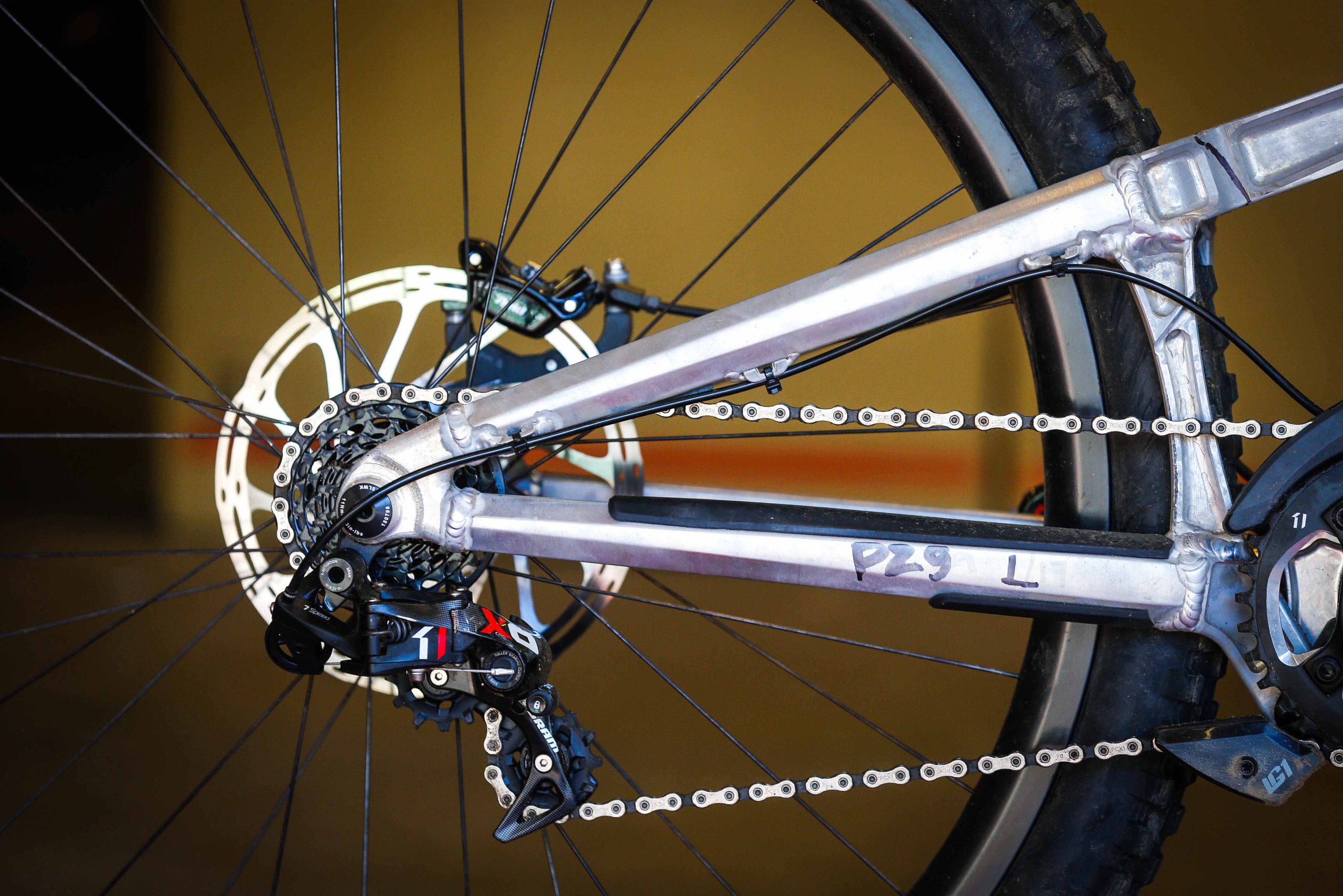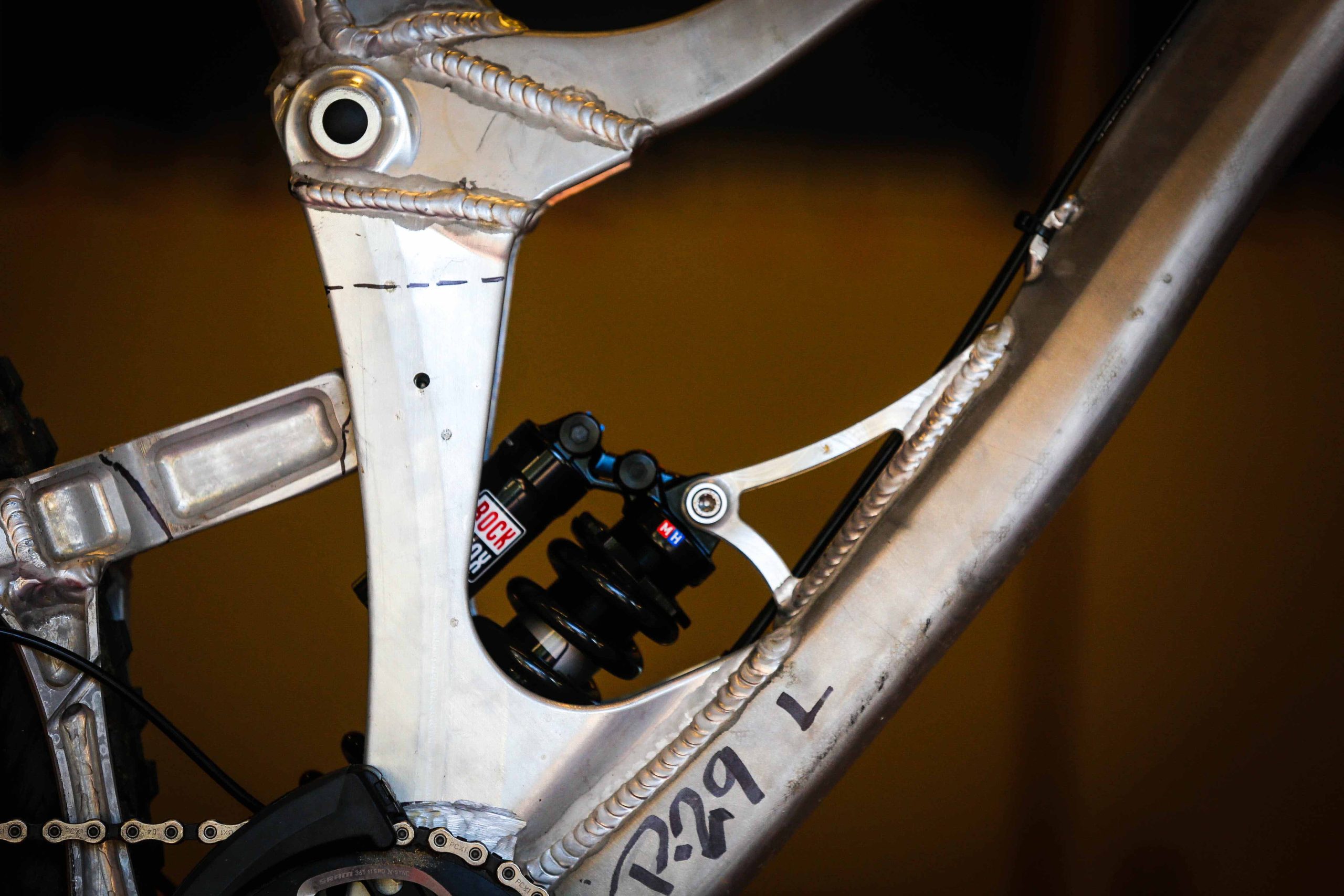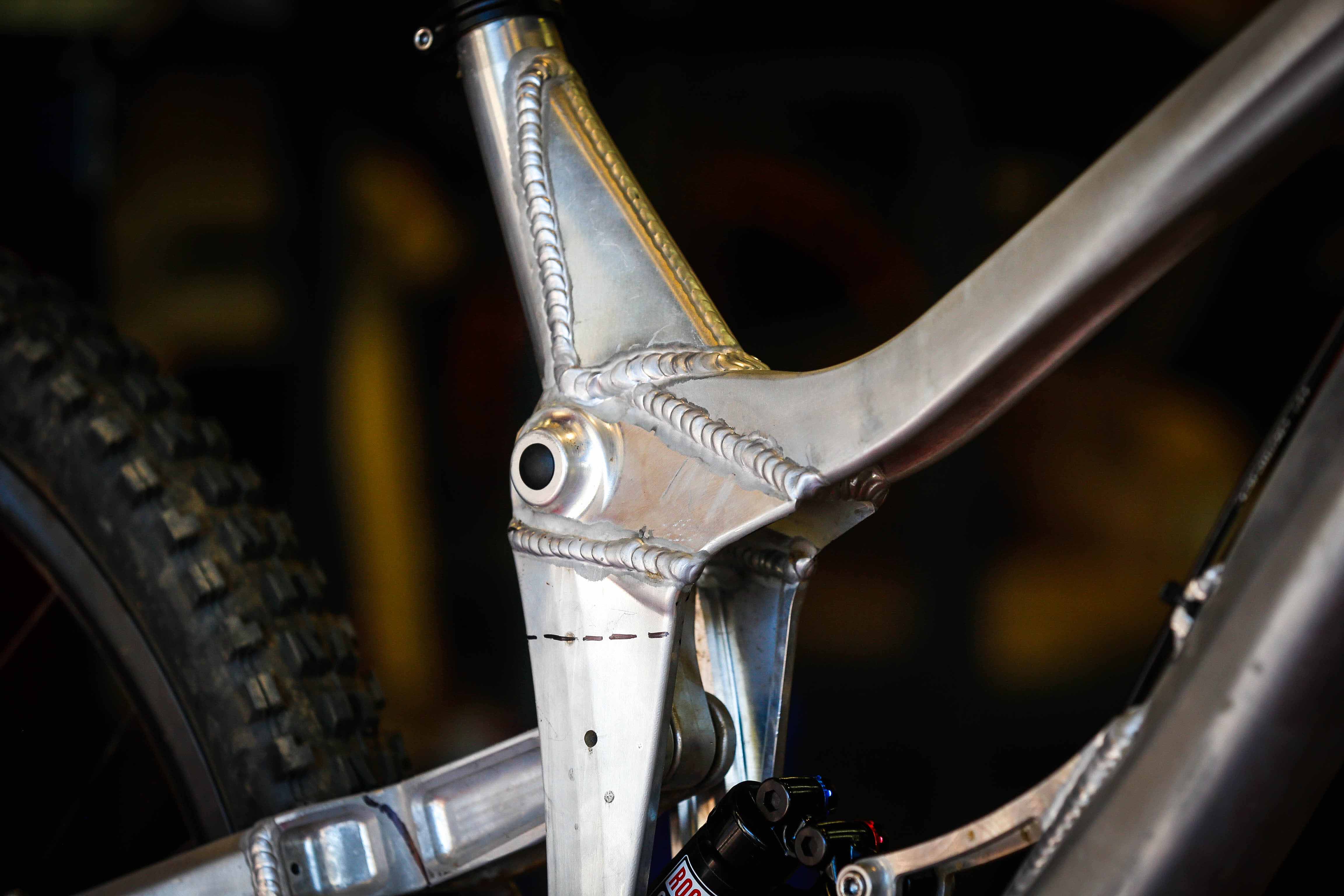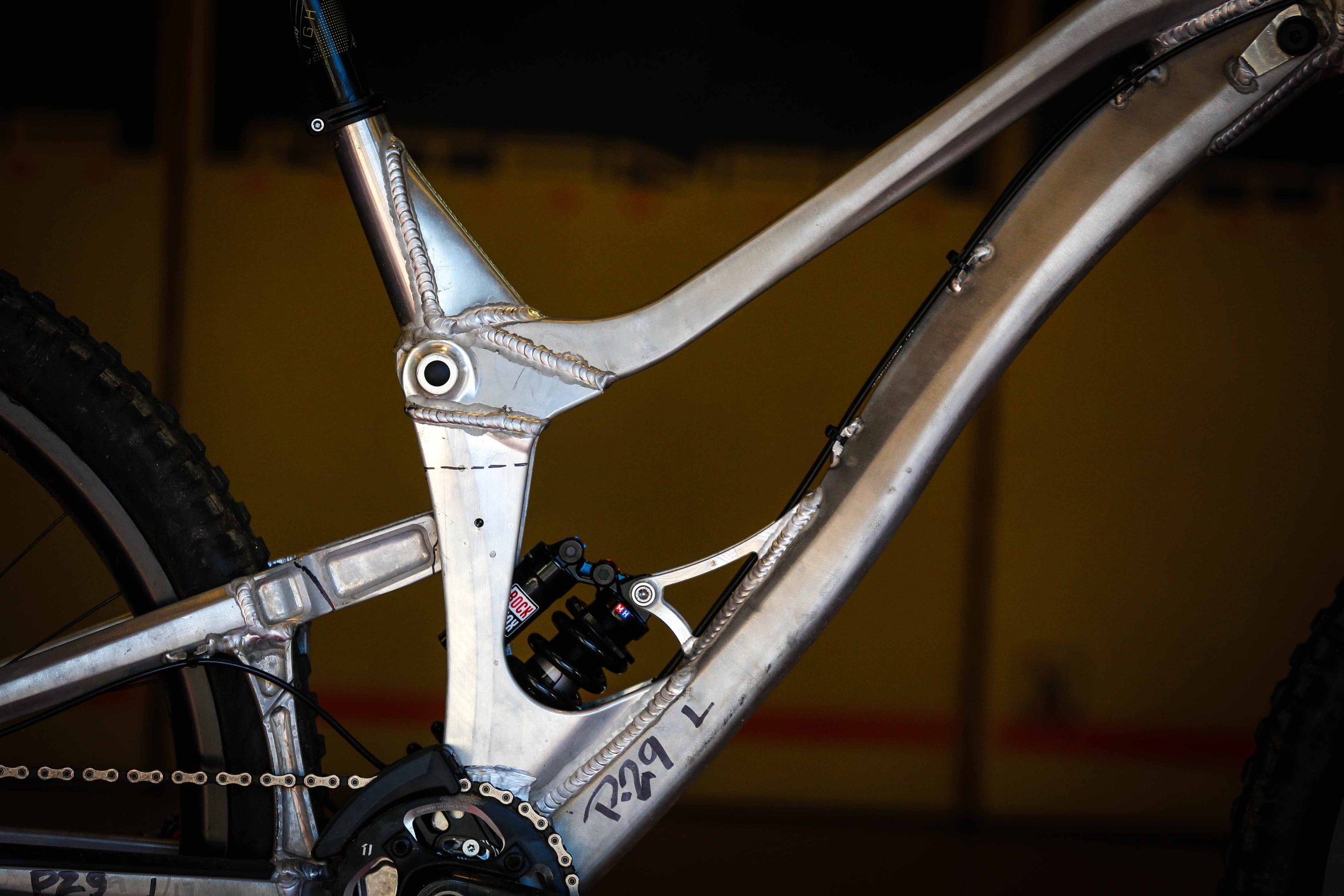 “As you know this is a dedicated 29 project for us and not just a bandied modified M16, so some of the architecture of the frame is chosen to accommodate 29” wheels better into the geometry /wheelpath we are looking for. The concentric to BB lower pivot allows us to keep chain stay length and clearance in better check that set up on M16 275 with link behind BB at same tine we still are able to get a nice initial rearward wheel path for good bump compliance. Also with the tunnel shock design and fully triangulated rear makes for really strong flex free structures. We will learn a lot racing these alloy photo’s and I have purposely kept them in works raw finish in case I need to make alterations or need to weld.”