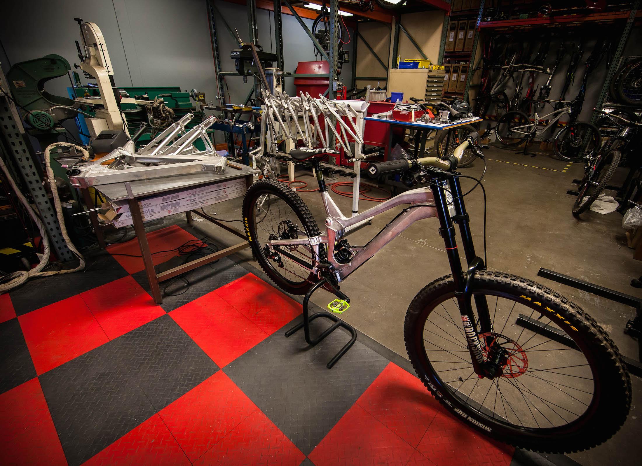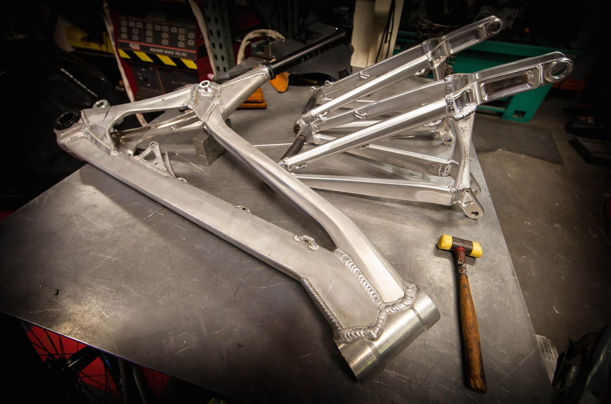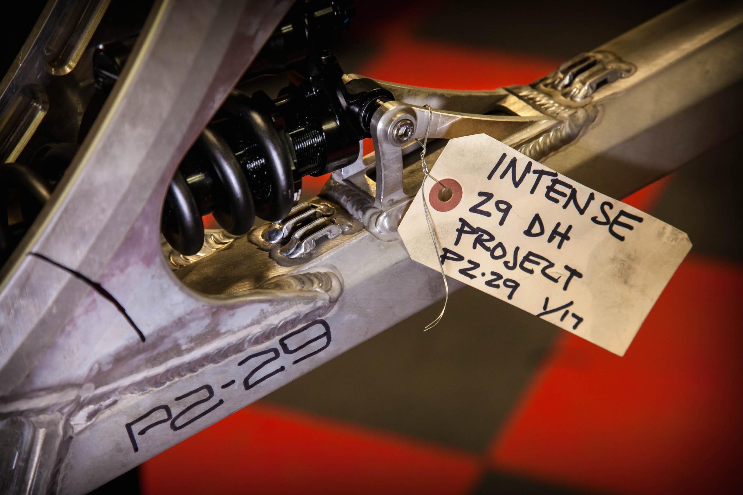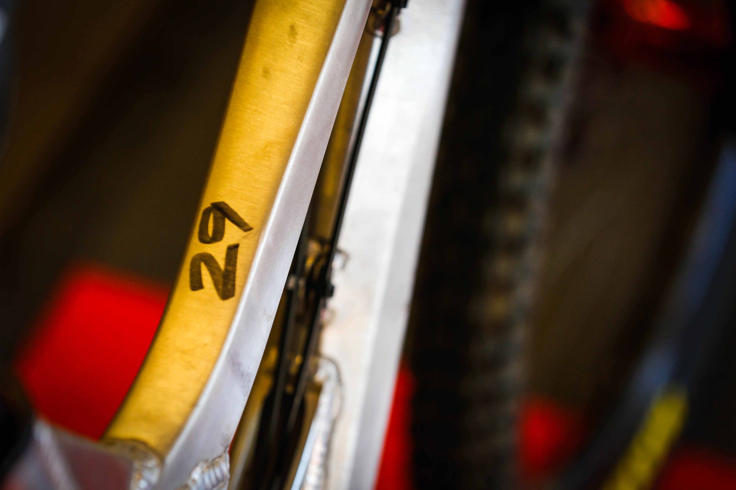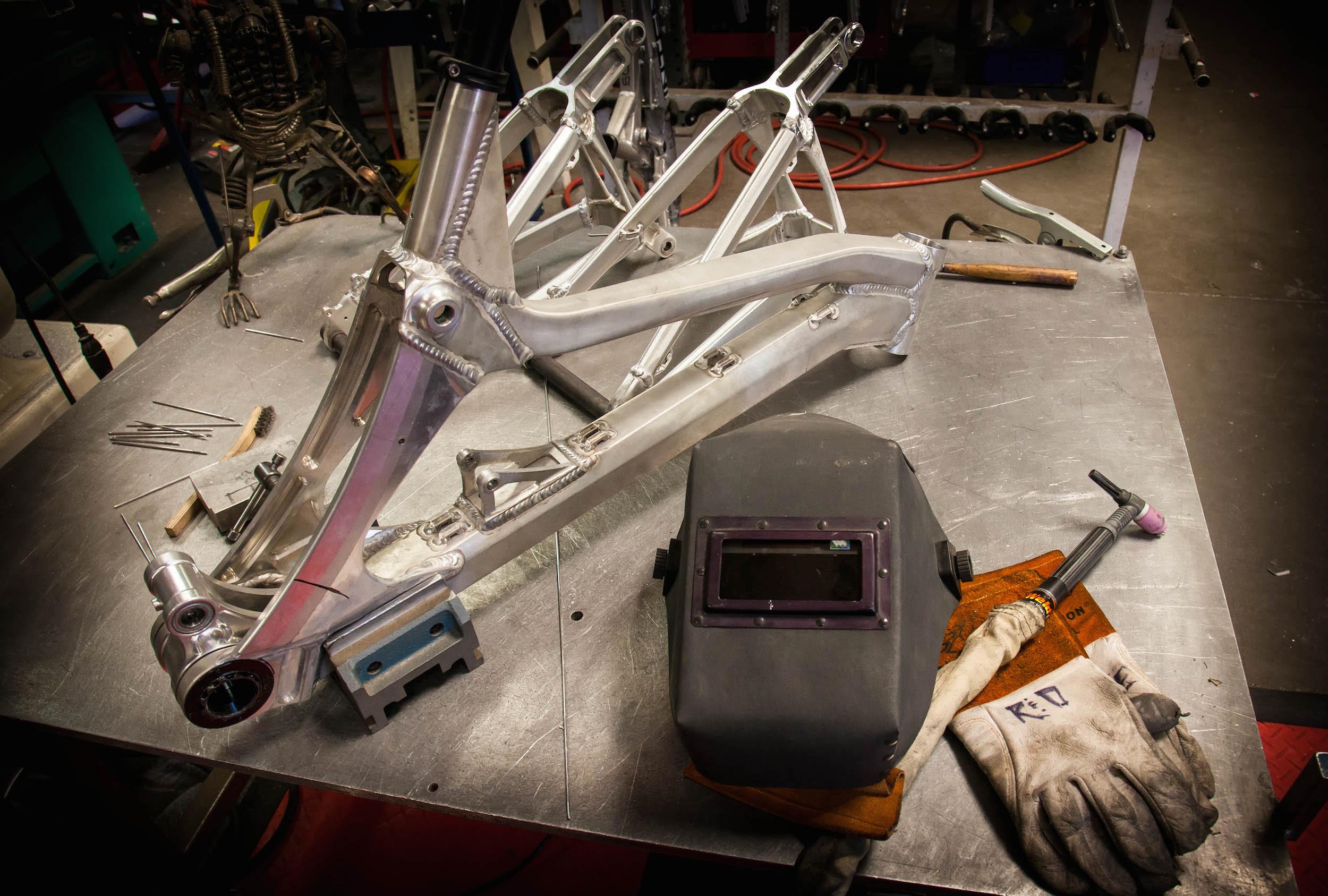 “As you know this is a dedicated 29 project for us and not just a bandied modified M16, so some of the architecture of the frame is chosen to accommodate 29” wheels better into the geometry /wheelpath we are looking for. The concentric to BB lower pivot allows us to keep chain stay length and clearance in better check that set up on M16 275 with link behind BB at same tine we still are able to get a nice initial rearward wheel path for good bump compliance. Also with the tunnel shock design and fully triangulated rear makes for really strong flex free structures. We will learn a lot racing these alloy photo’s and I have purposely kept them in works raw finish in case I need to make alterations or need to weld.”