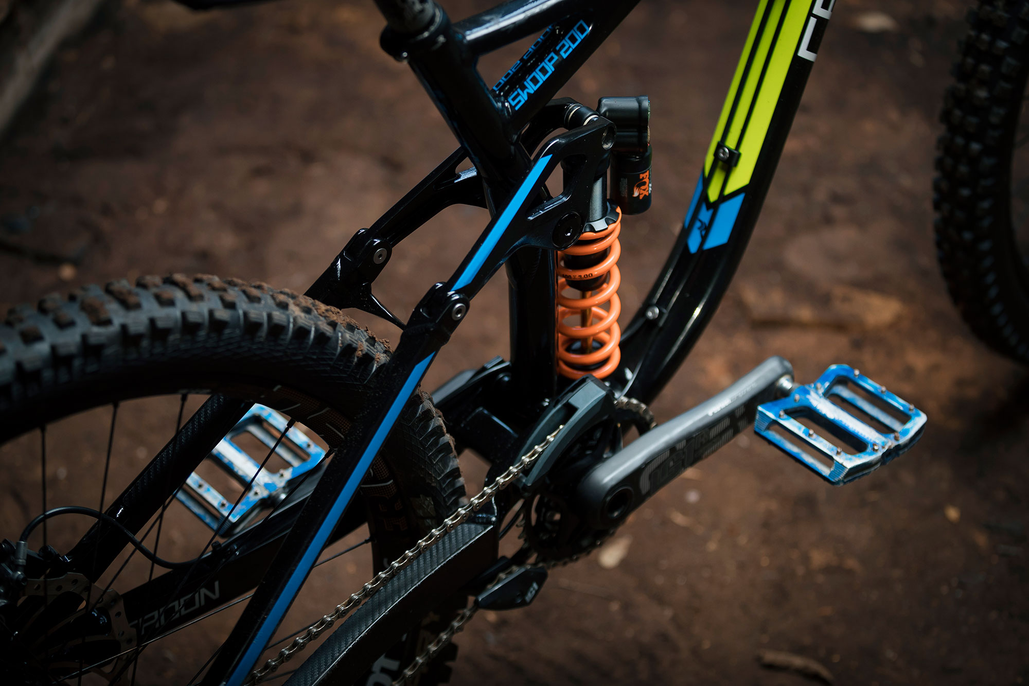 Its in the geometry numbers however that we find one of the biggest strengths of the Swoop. Take a look at at the reach figures on this bike. For example the 20” bike at 469mm reach makes it one of the largest downhill bikes on the market, with only bikes such as the XL Canyon Sender longer at 480mm. Many riders might want to consider the 18” version of this bike as well as it is still the equivalent of many size large bikes. We are not saying reach is the be all and end all of bike fit but it’s a good starting point. So this bike is already out of the blocks sharpish.