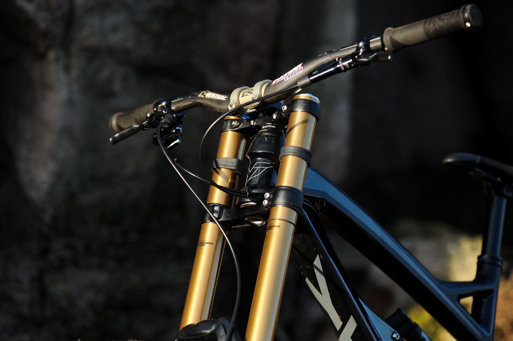 Eight mil’ higher in the bottom bracket but the same amount longer in wheelbase than a similarly sized large Demo and with a slightly longer front centre, those are the numbers many will be looking at during Gwin’s transition form Californian to German race hardware. Some might also point out that 5′ 9″ Gwin wasn’t exactly riding production Demo last season – revised linkage/Fox damping – whilst this production test bike isn’t far off what the champ is currently riding – and which he has already taken to glory at the opening world cup at Lourdes a few weeks ago.