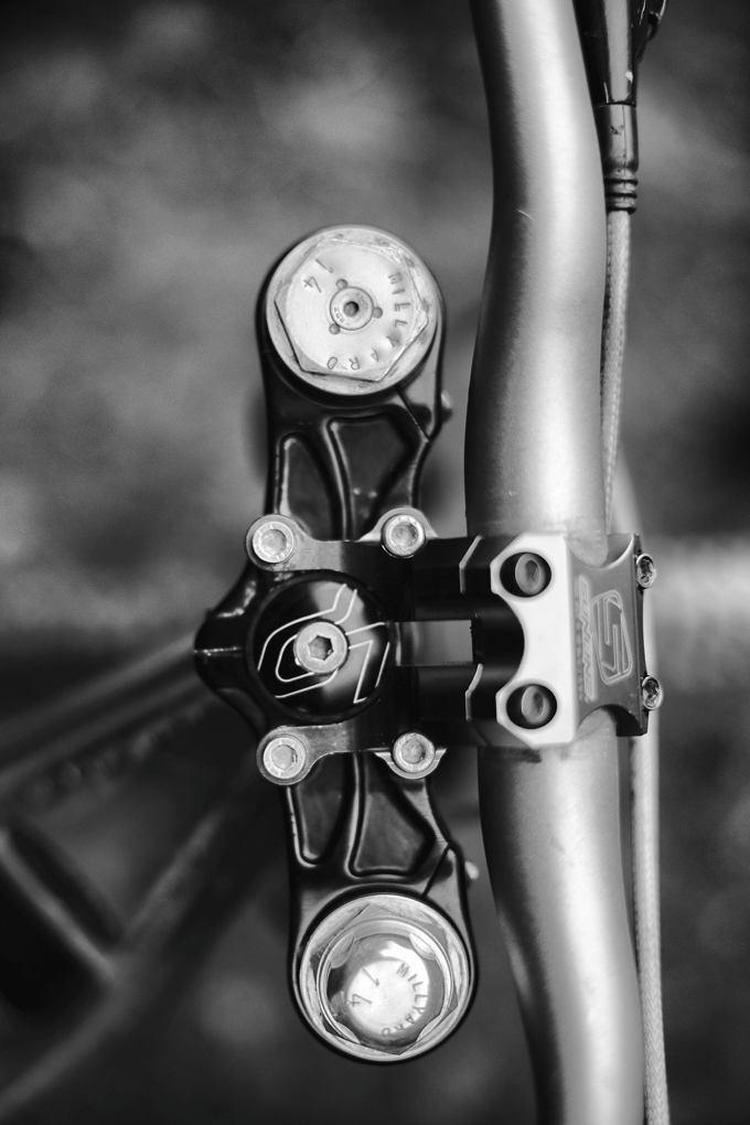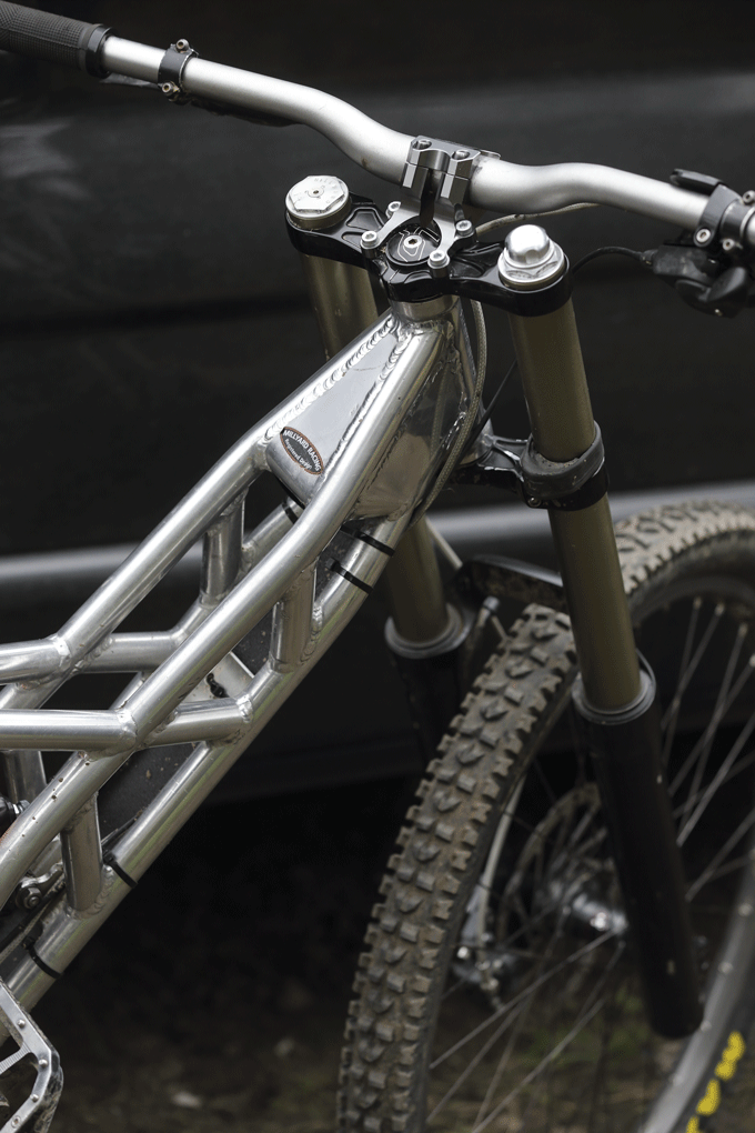 The Millyard bike simply made a priority to power through the biggest nastiest terrain possible and not pedalling. It was only many years later that found out that I had broken my 1:04 track record on what was ultimately a 150mm rear travel bike, but everything went quiet from Millyard as he set about his other inventions – his recent Pratt and Whitney motorcycle being the most notable (Google it). The phone rang. Allen was excited about a new gas cartridge he had made for the bike. I didn’t take convincing and was equally enthusiastic to get some runs done. It didn’t disappoint, the bike is now more balanced and rather than rely on the rear because of its superior traction, steering and less arm fatigue, you can now charge anywhere, anytime. It’s all pretty crazy. The exact detail he prefers not to show, but from what I know it’s frighteningly simple, but like all classic systems it all depends on the size of the holes! The cartridge has simply been custom fitted to a Fox 40 and for pressure Allen now relies on the simpler, cheaper and easier to transport Argon gas to pressurize. As mentioned, riding the Millyard bike is a very different experience to a conventionally damped bike, it requires a much diff erent style of riding and also requires trust in the system. The reaction time is acute, it simply knows when and how to absorb, so rather than pick and placing the bike (avoiding obstacles), this bike will charge on through. He has the chassis built to take this as well. What would be its commercial value? Huge. For riders wanting trouble free, silent runs down big Alpine terrain it is impressive. It simply railroads big country. Pedalling remains slightly unchartered territory but to focus on that would be massively missing the point.
