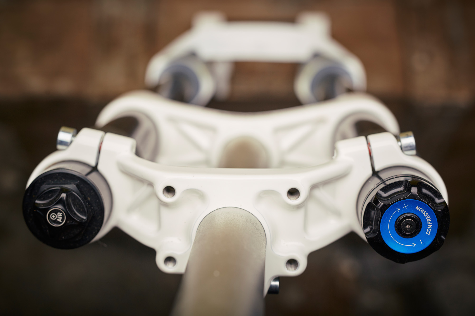 At just over 2.6kg, with 200mm travel within its 35mm upper tubes available in black, diffusion black or white it offers beginning stroke rebound and low speed compression adjustment making it a simpler fork than its predecessor or many of the competition.