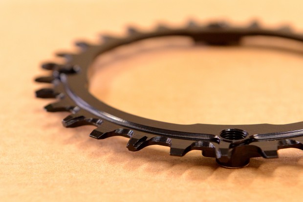 For those of you that have been hiding under a rock for the past year or so I’ll give a very quick explanation of ‘narrow/wide’ chainrings. They are simply chainrings that have alternating teeth, narrow then wide (or thick then thin if you like), so that they provide a better ‘fit’ with your chain (which if you look at it has alternating narrow and wide links). The benefit is that these rings really help stop you dropping your chain if you are running a single ring. When done right, and combined with a ‘clutch’ rear mech, they work so well that for anything apart from DH racing you really don’t need any kind of chain device.