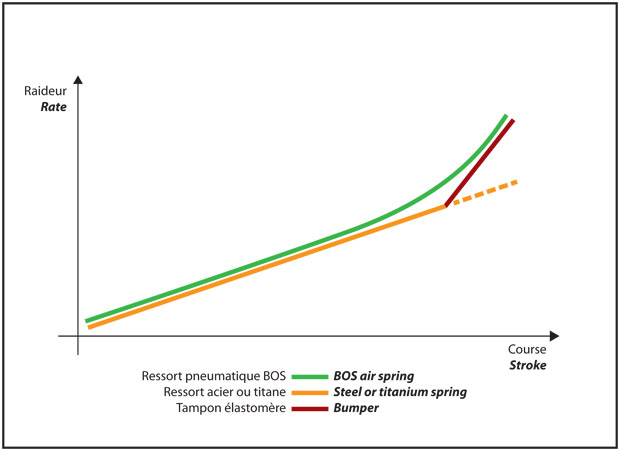 The main problem that engineers faced was that an air spring is progressive : its rate increases while it is compressed. On the contrary a coil spring features a constant rate. If you want to use all the travel and have an efficient control of the shock through damping, this constant rate is a key point. Therefore, Bos couldn’t launch an air shock without reaching the same working than a coil shock. Which is now the case.