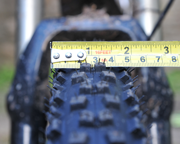 Only the two more expensive versions use the Black Chilli compound, and sadly unlike the basic folding version these only come in a 2.2″ version. Quite why Continental have chosen to do this when they also offer the cheaper tyre in a 2.4″ version is a bit of a mystery to us. As you can see in the photo below the 2.2″ doesn’t come up too small, but we definitely feel that a 2.4″ Black Chilli tyre has the potential to be an amazing weapon for agro 29’er riders. Hopefully that option will be added to the range in due course.