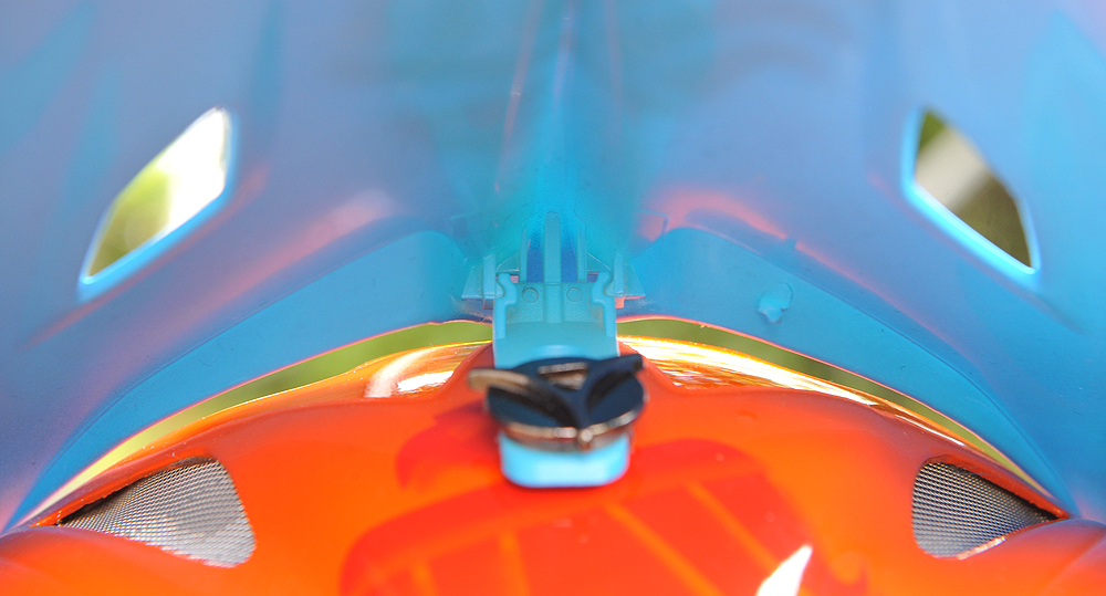 And finally here’s a close up of the nifty little break-away device on the peak. If you smack the peak on something it unclips and allows the peak to rotate further backwards, hopefully stopping it from breaking. Afterwards you simply clip it back together.