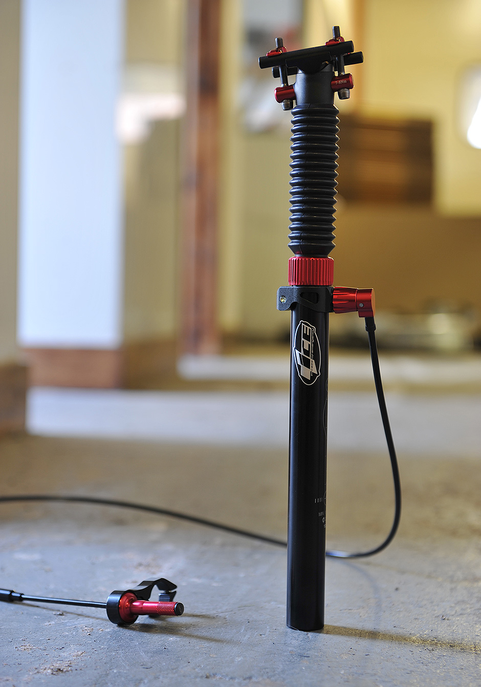 The other features of the post that impress us are that the cable is mounted to the stationary part of the post and exits at a good angle, so there’s none of that baggy cable thing going on. The saddle clamp is also a well proven design which allows precise adjustment. The rubber boot which takes care of sealing duties is fixed in place at both ends so it should do a fine job. And, it’s great to see a post coming in a 27.2mm size (it does also come with either a 30.9 or 31.6mm shim).