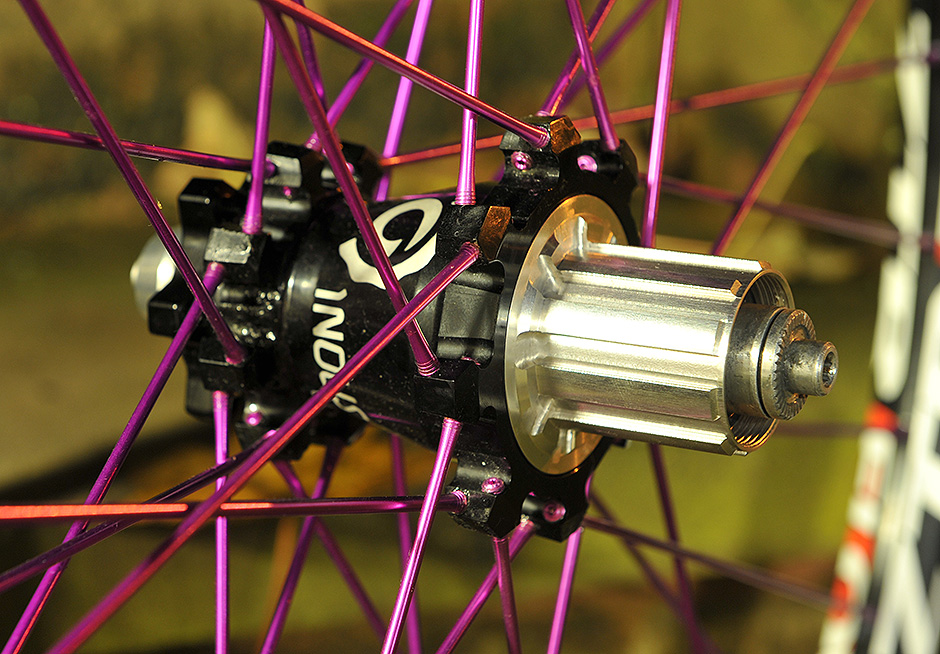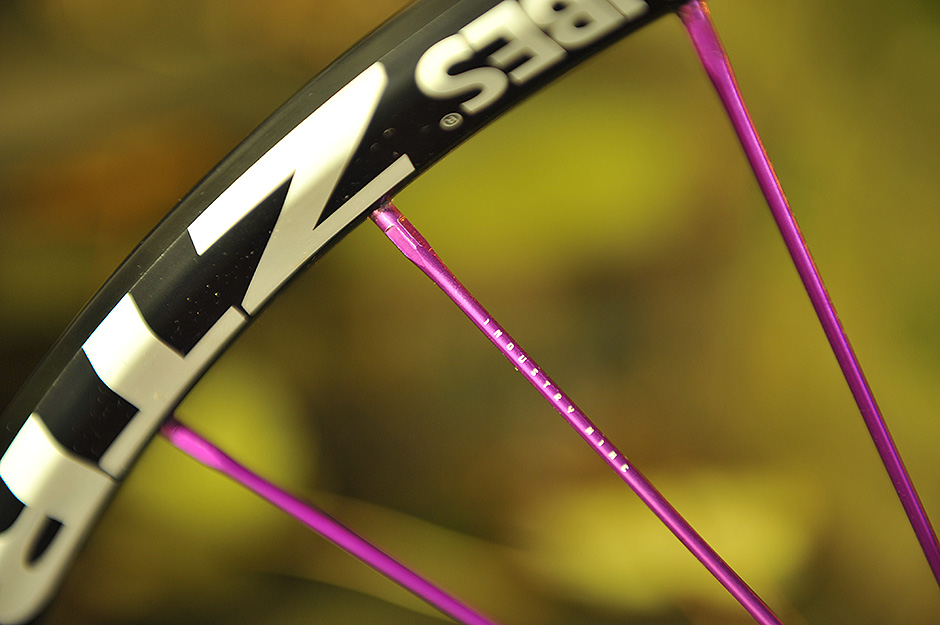 The final part of the puzzle is those unique spokes. And yes they do come in loads of other colours apart from purple, as do the hubs. By using 7075-T6 aluminium Industry Nine are able to produce a spoke that rivals a 14g stainless steel spoke in the tensile strength stakes, yet weighs as little as a tripple butted spoke. The spokes also significantly improved lateral stiffness over any butted spoke, something which has now become even more important thanks to the introduction of larger wheel sizes. You’ll also notice that there’s no nipple, instead the spoke simply threads into the hub body. This reduces the rotational mass of the wheel considerably, making them ride even lighter than they are. The lack of any bend in the spokes increases strength even further.