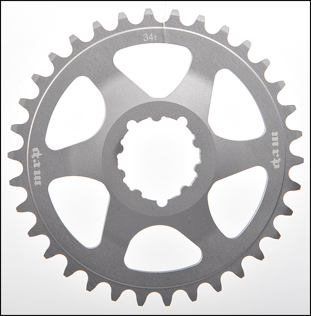 The MRP Bling Ring is compatible with any SRAM or Truvativ chainset that has a removable spider (think XX, XO, X9 and AKA) and it provides a far lighter and neater single ring solution. Because you’re removing the spider, and any need for chainring bolts, the Bling Ring is up to 40% lighter than a standard set up. The 34t ring shown here tipped our scales at just 83g, which isn’t much heavier than many standard rings alone.