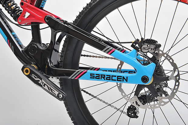 Yes the front end is still made from aluminium but the new sleek looking rear end is indeed made from the magic black stuff. Why only the rear end? Well for starters it’s much easier to keep costs down if you only make the rear end from carbon as both bike sizes use the same rear end, but Saracen also found that they could save far more weight from the rear end by switching to carbon than they could at the front. Basically they just didn’t feel that it was cost effective to offer a carbon front end as the weight savings would have minimal despite the cost increase being high. The 600g weight saving at the rear is far from minimal though, especially when you consider that all that weight would have been unsprung mass.