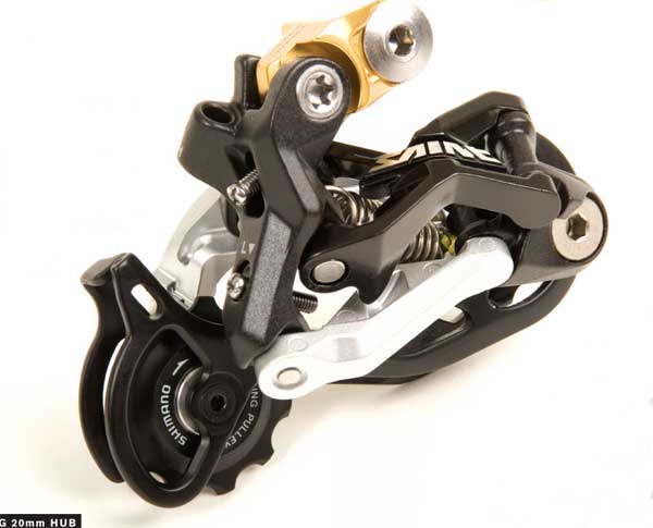 Easily the biggest change in the new Saint groupset is the rear mech which now does away with that stupid system that hardly fitted anything, and instead features the low–profile Shadow technology to save it from impacts. As you can see from the photo it’s built like a brick shit house compared to any other rear mechs out there, but yet it still weighs a whole load less than the old Saint one. We’d be happy to bet that this is by far and away the strongest rear mech that you can currently spend your hard earned wedge on. Available with either a medium or short cage.