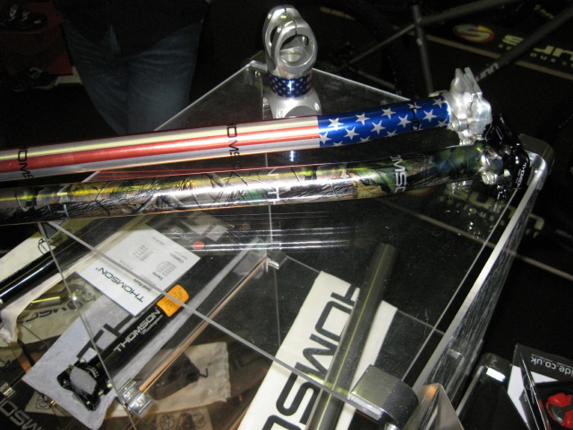 www.lhthomson.com something different from thomson, there anodizer asked for some posts to play with, this is what they came up with, i thought at first glance it was by water transfer dipping, nope…hand anodized, multiple dips and hand masked to get the effect, very labour heavy process but stunning results. The stars and stripes has already been commissioned by the USA cycling team, and a Union Jack team only issue is on its way for UK riders. As yet this is not viable for general sale due to the hand dipping of a single post at a time, not 500 posts being done in black in a big vat, thomson reckon on some limited edition show pieces, maybe an annual one off pattern. For now there is no way to mass produce the effect, stands out from the bright single colours everyone else has.