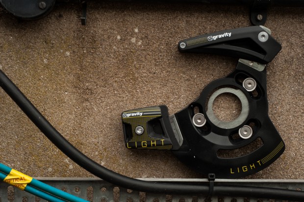 The last product that we’re showing you from the Gravity Light collection is the chainguide which can be run with either a 36 or 38t chainring. On the surface it may look similar to other offerings but the construction is different in the fact that the heart of the guide (both the back plate and the taco style bash guard) is made up from a Dupont Hytrel high-impact composite rather than an aluminium backplate. The upper and lower guides are then mounted onto small aluminium sections which in turn are mounted to composite back plate. Does this make much of a difference? It’s difficult to tell really but it does seem strong and stiff enough, and if subjected to a large impact I think it’s more likely to spring back into shape than permanently bend. Weight wise I don’t think it makes much difference as the 218g weight of this one is comparable with other more conventional designs. One aspect of the design which does seem a little outdated though are the guide mountings/adjusters. Yes there’s only one bolt, but the lack of captive nuts means that initial assembly and major service work is a little more fiddly than it should be. The fact that the angle of the top guide isn’t fixed solid in relation to the back plate can be seen as either a good or bad thing. I think in most cases it isn’t great, but on the other hand if you have a particularly complicated frame design this feature might prove to be a bonus. The chainguide is available with both ISCG and ISCG05 mountings, plus it comes with an adaptor for bottom bracket use. The thing is though that this product is up against some serious competition, and it’s not exactly competitively priced.