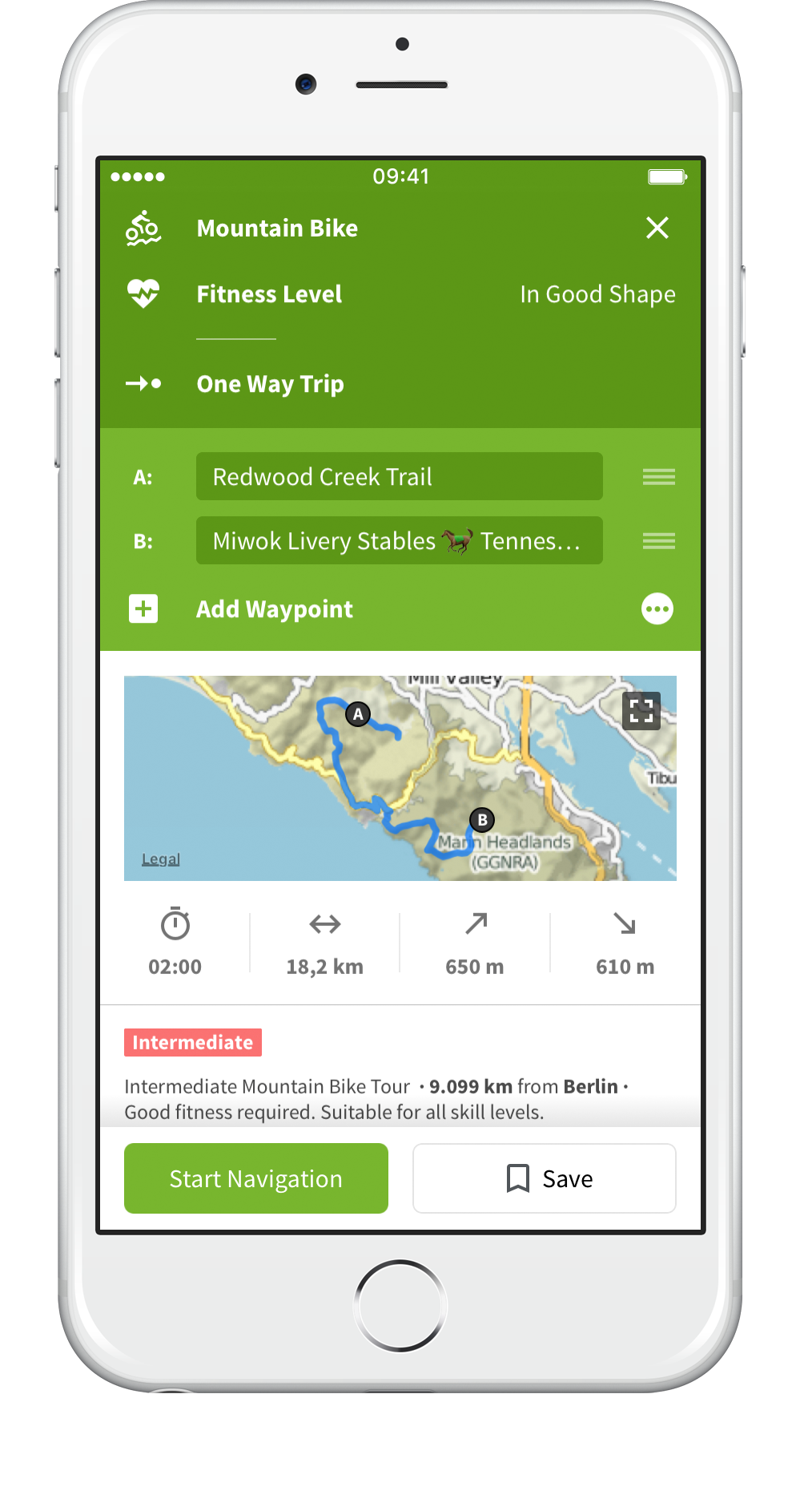 Firstly it’s a full on route planning tool. Yes, it lets you know where the best trails are but Komoot will also get you from one to the next in the best route possible. Before you head out, you’ll be able to know exactly how to link up the trails you want to ride, how long the ride will take you and how technical your ride is going to be thanks to a pretty detailed breakdown of surface types and an interactive elevation profile.