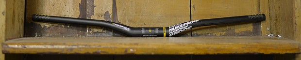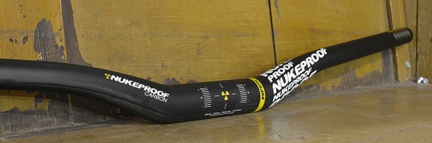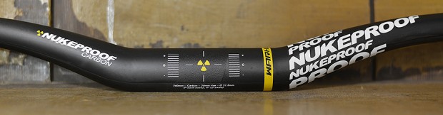 Nukeproof have been making bars for several years now but these are the first carbon ones that we’ve ever seen from them. From what I’ve heard they have been working on these for a fair old while and in the process they’ve destructively tested a huge number of prototypes, and their competitors bars. The aim wasn’t just to produce one of the strongest bars on the market, it was also to produce one that doesn’t shatter catastrophically should it ever fail. Nukeproof reckon they’ve managed to achieve those goals, and the result is a bar which they say is considerably stronger than any of their aluminium offerings, and yet at 241g this carbon bar is around 60g lighter.