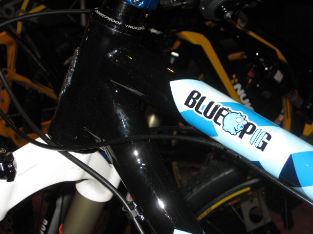 Found a race face, Steve Larkin, ex student and Wide-open mags hard-tail animal and 4x racer, now working for Hot-lines and very keen to show me the new Ragley Blue Pig. OK we have history as we have raced together, and i fancied a go on a Ragley Bagger288, turns out the 288 is no more, so lost the chance there, and the Blue Pig has been tweaked angle wise for a more burly fork, the head tube gussets have been reworked and it’s taking the role of the 288. Loved the new jewel like head tube badges, some neat little trick finishing touches here and there. Picking the bike up was a pleasant surprise too, just the thing for doing the No-Fuss events Downhill enduro at Fort William. Yes i would race that, would batter it senseless but looks a lot of fun. Wonder if Hot-lines do loaners.