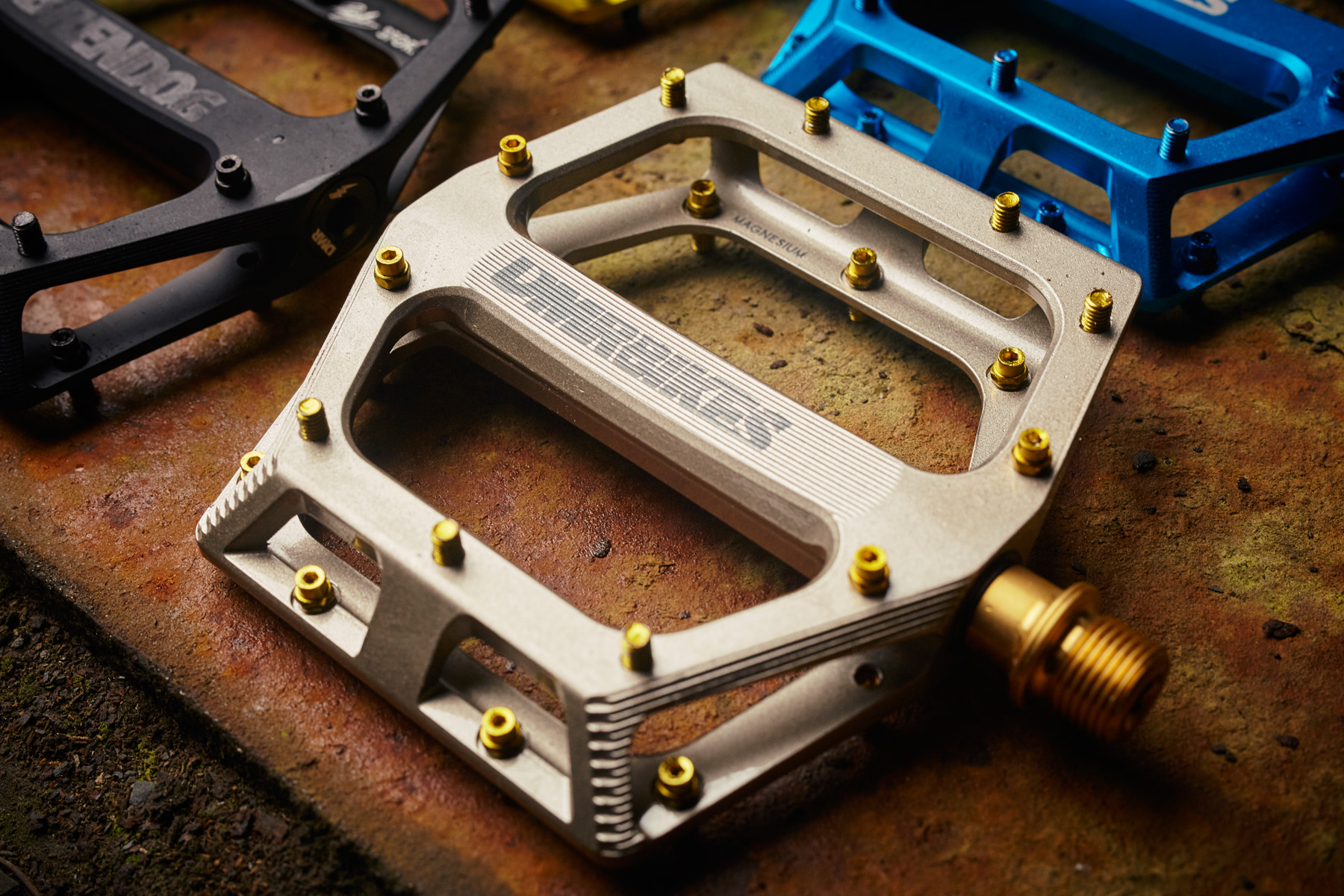 Shape, depth and pin placement are the qualities that make this pedal a winner. The 6061 aluminium platform is a great length and width combo, the profile is also ‘just right’ with a 17mm concave footbed. Eleven adjustable pins give tunable traction, whatever your tastes and shoe choice. Flip them to fine-tune grip. These pins are not the toughest (replacement kits are readily available) but their placement is perfect; these pedals have been designed by riders who spend all their riding time on flats, not just some of their time.