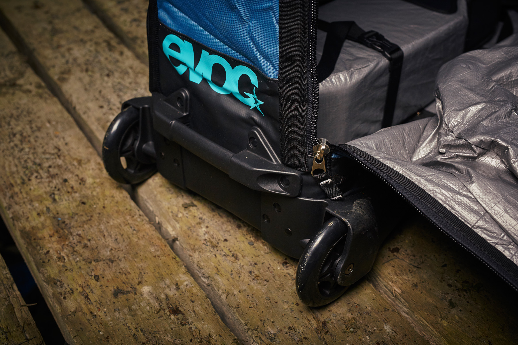 So what makes this bag so good? The construction is top notch from this German company, and no compromises are made. The solid molded undercarriage has full-length metal sliders with two reliable skate wheels (with a third clip on wheel if needed). This provides a super stable base with less chance of toppling over. The wheel pockets (any size 26” to 29”) have added protection for disc rotors and are positioned at the rear for better balance when pulling the bag. The really unique feature is the removable tubular aluminium support frame. This holds your bike by the front axle and lets you easily pack your bike inside the bag. The bag itself is padded, with extra impact protection in vulnerable areas and glass-fibre supports rods. The zips, handles and fittings are all built to go the distance.