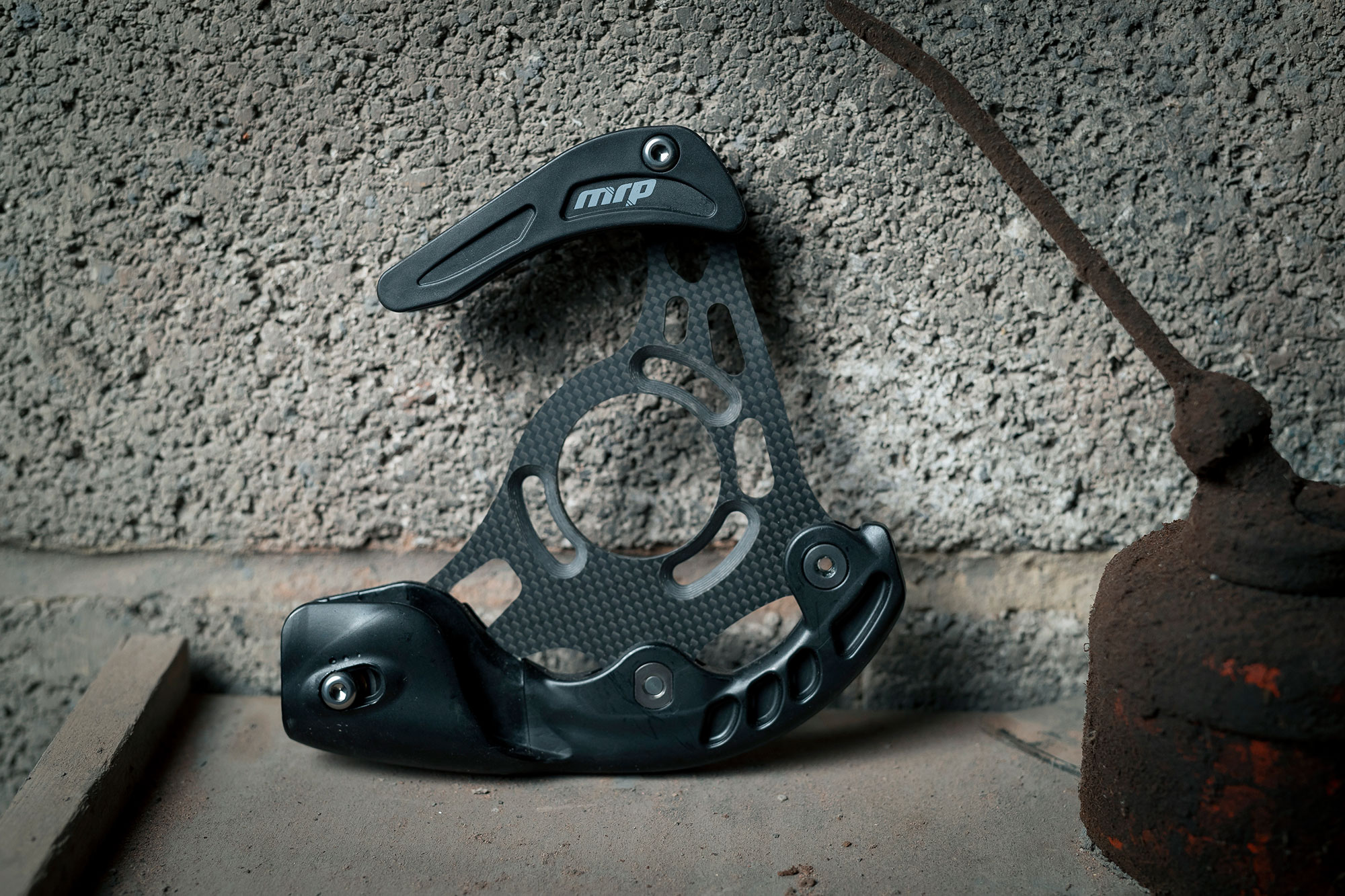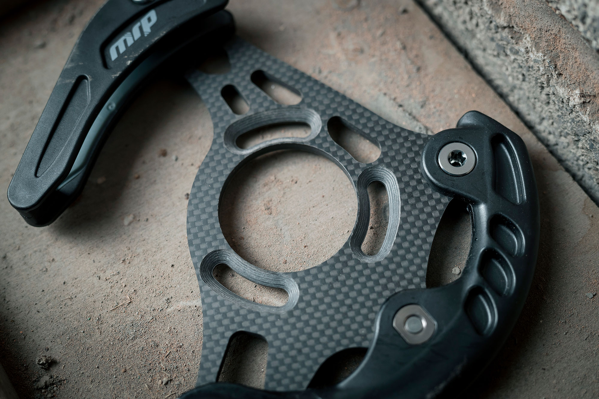 Launched about two years ago, the latest take on the original, is the G4. Here MRP has redesigned the upper retention system. This co-moulded ‘HD’ guide is nylon but now has a softer durometer TPU material on the interior walls and ceiling reducing noise levels from the chain; an improvement on the older G3 model. The lower skid plate has had attention too, now being made from an improved material. The G3 weighs in at between 153–204g, depending on whether you go for the carbon or aluminium back plate.