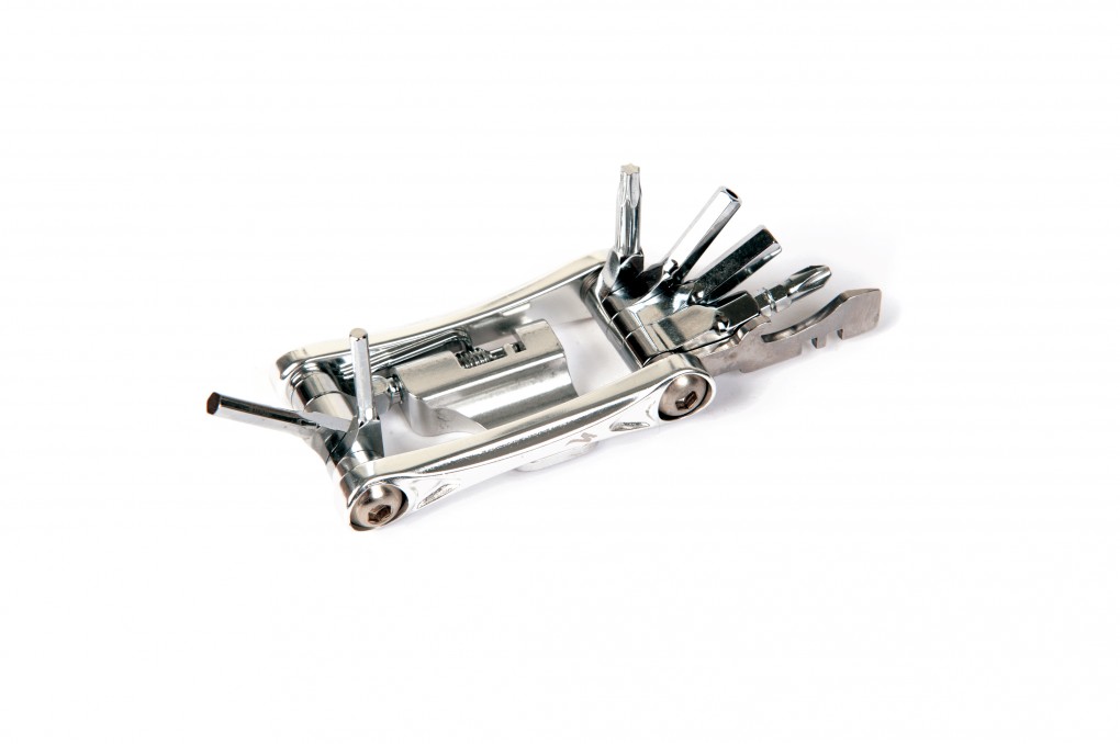 This ‘Emergency Multi Tool’ is the lightest on test (just), with a chrome plated finish and a slightly smaller, neater size than most. Very similar to the Lezyne SV10 it has the usual spread of allen tools with two screwdrivers, a bottle opener and even a disc pad separator…handy.