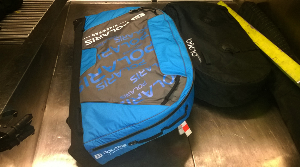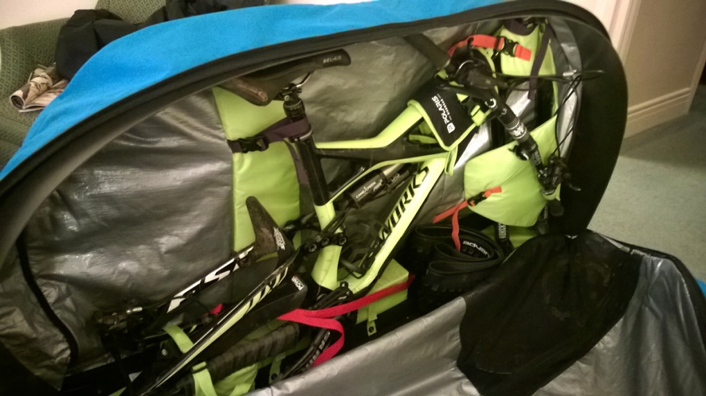 Due to the fact the wheels are in line with the bag its still topples over although not as easy as some, plus unless you weight the bag completely evenly it does track to one side, on the flip side there are no wheels sticking out to get knocked off so I guess you have to weight that one up. The pulling handles seem to be just in the wrong place and the wrong way around, if they were 5-10 cm lower and across the bag they would be perfect, I say this because I’m 5ft 10 and lifting with the upper handle meant the bag dragged on the floor, the lower handle with the weight of the bag and handle orientation dug into the hand, the other hauling handles were in perfect positions. The bag arrived in Vancouver after being hurled into the collection zone, the frame, wheels, bars and everything else intact, all held in place despite the best efforts of the baggage handlers, the same was true on the return journey. Overall I was very impressed with the security of the fixings and protection of the bag. The 800m arm pump special was repeated at the other end on the way to collect the hire car.