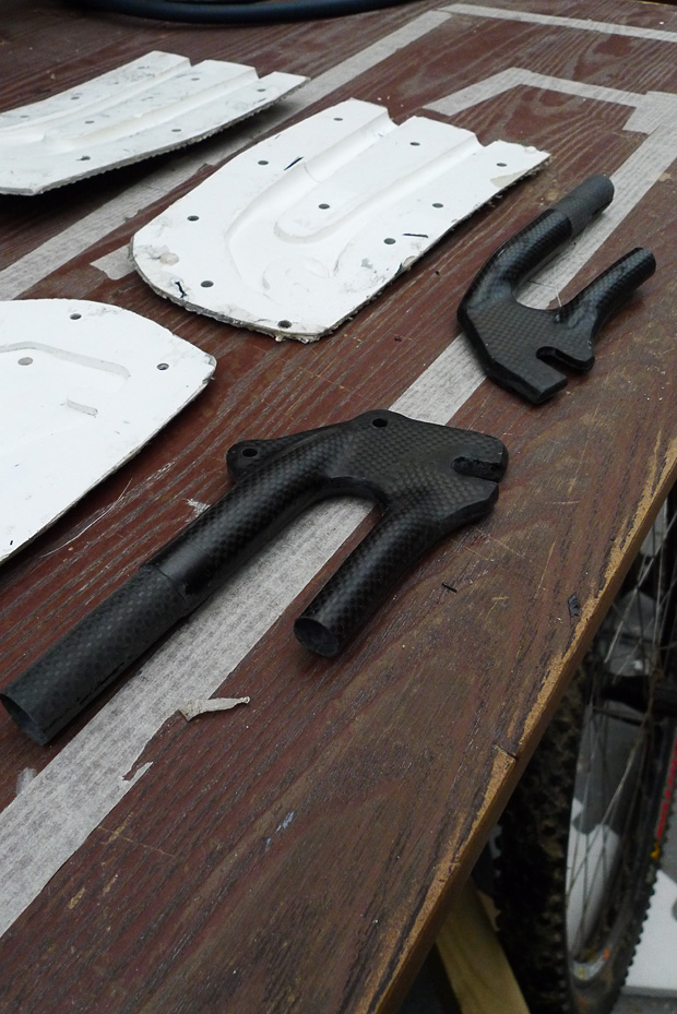 Initially I designed a steel swingarm for it and I made all of the tubes ready, however it had some more complex bits that needed CNC’ing. Phil just didn’t have the time, so I decided to go ahead and make a carbon swingarm as I have everything here in my workshop to do it. Initially I made up some moulds for the dropouts as these were a tricky area, the rest of the swingarm is made without moulds of any sort. I made some simple thin walled tubes and an internal structure linking the shock mount and main pivot area, I then made the rest of the swingarm with blue foam carved to shape.