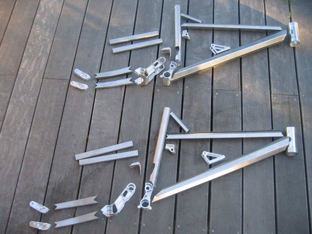 The two lads decided to produce everything themselves including the frame tubes. The tubes start out from a sheet of laser cut aluminum in 6061, which is then formed on a hydraulic press and later welded.