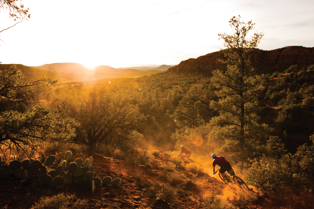 A rough old coyote slips through the skinless knuckles of the red Sedona outcrop, glancing, shimmying close to a group of riders talking about pieces of bike and slugging some blood red spirit in this global power spot.
