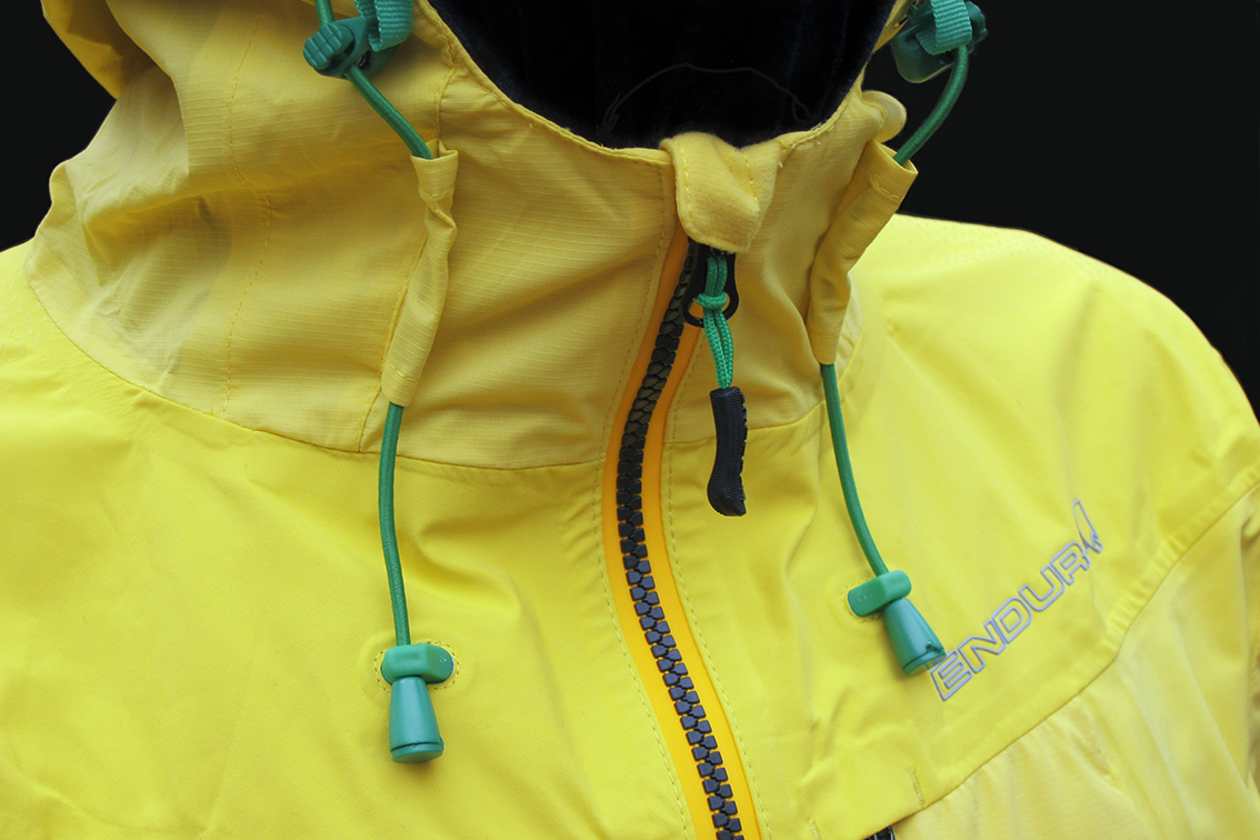 The jacket has an ample hood that will cover a proper trail/enduro helmet, giving you full cover in high mountain situations. It has 3D adjustment (via captive elastic and toggles) giving good visibility when on the bike. The hood is articulated so head movement and vision are not impeded.