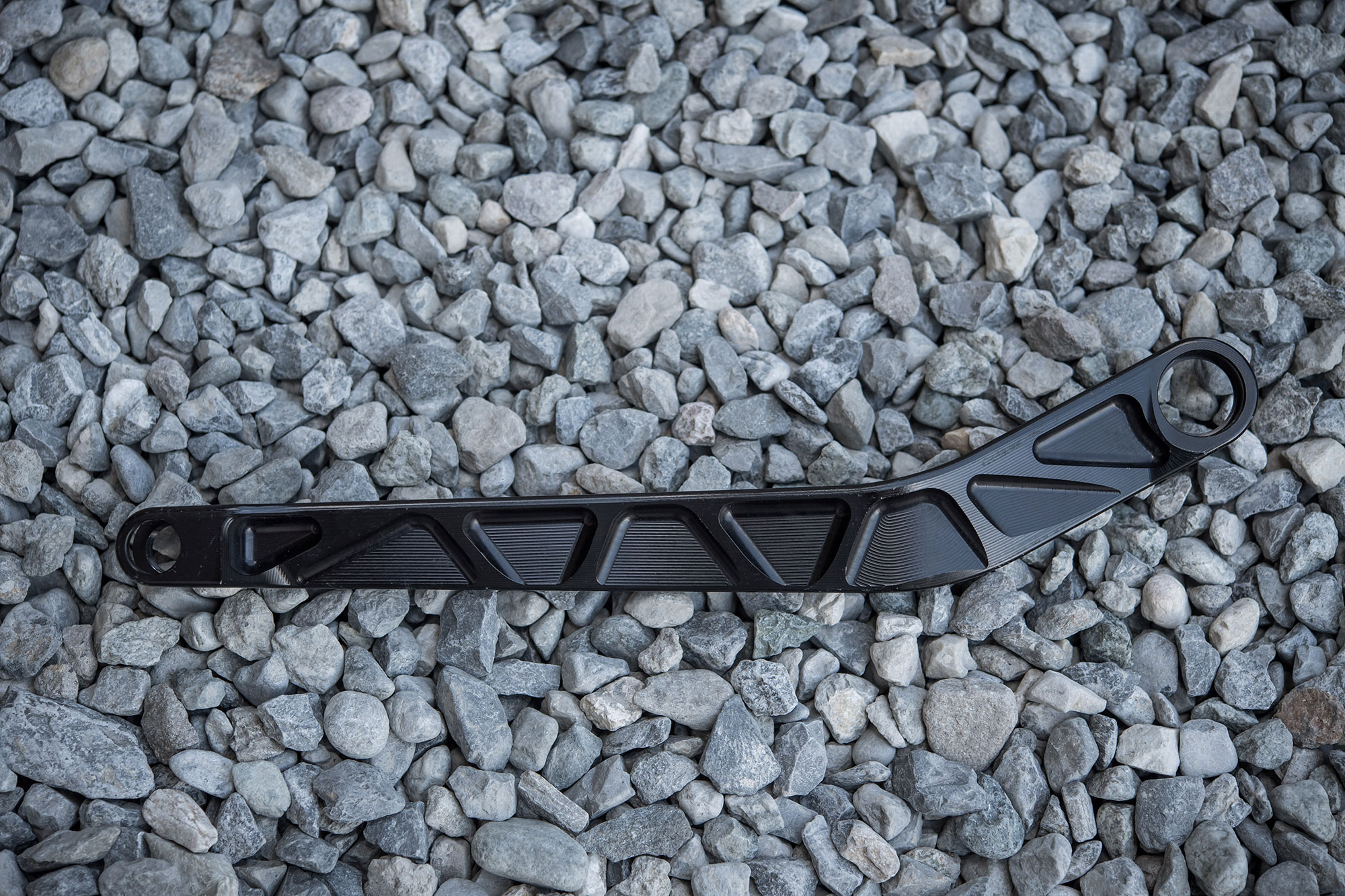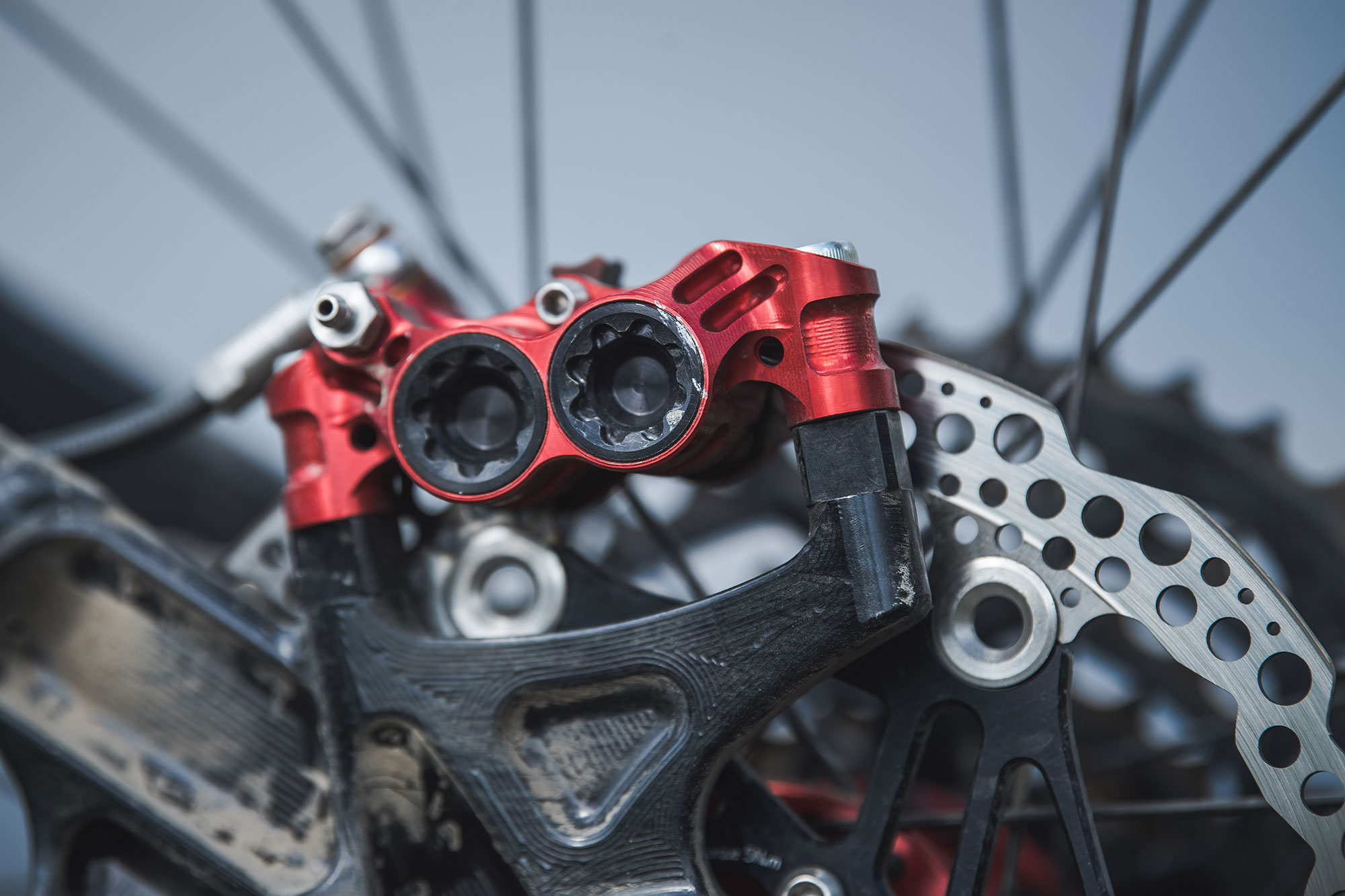 The distinctive back end uses a narrower, 130mm wide, rear hub and a dishless wheel with a thicker 20mm axle. The design (kind of) achieves a similar, wider wheel brace angle to Boost 148, and relies on the hub flanges sitting tight to the brake rotor. The stays are also moved out on the driveside to provide a better chainline, and in for more clearance on the non-drive side. The heavily machined stays look pretty funky and Hope is also experimenting with a funky way to make them by using a bonded, rather than welded, assembly technique, so it can use a better grade of aluminium that doesn’t like welding guns. The unusual radial brake support uses a motorbike style mount and spacing each side of the caliper equally to adapt to bigger rotors, rather than specific adaptors.