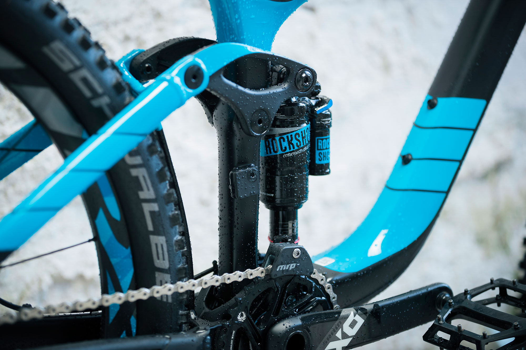 The Lyrik on the front offers that little bit more support on the front and allows you to dive into techy sections with that bit more composure. Combined with the 800mm bar, there’s very little that can knock this bike off course.