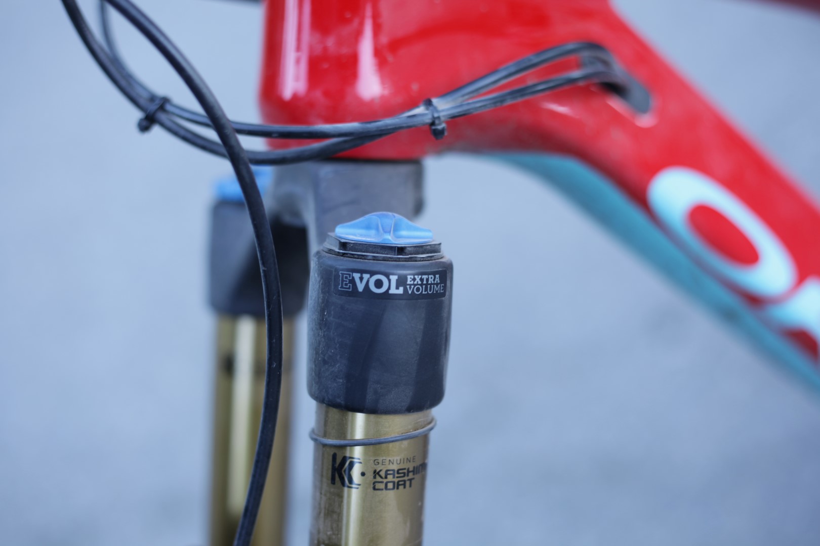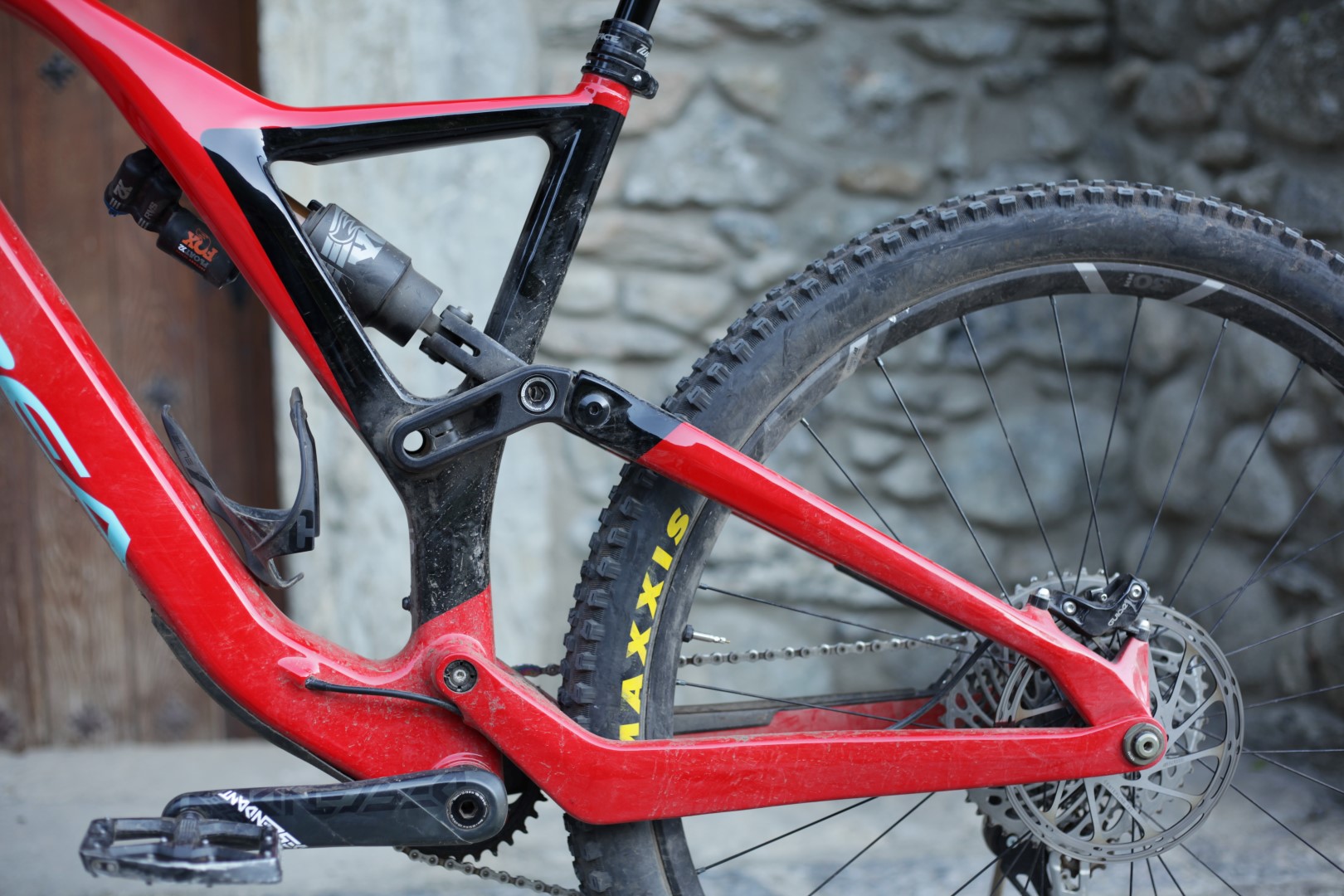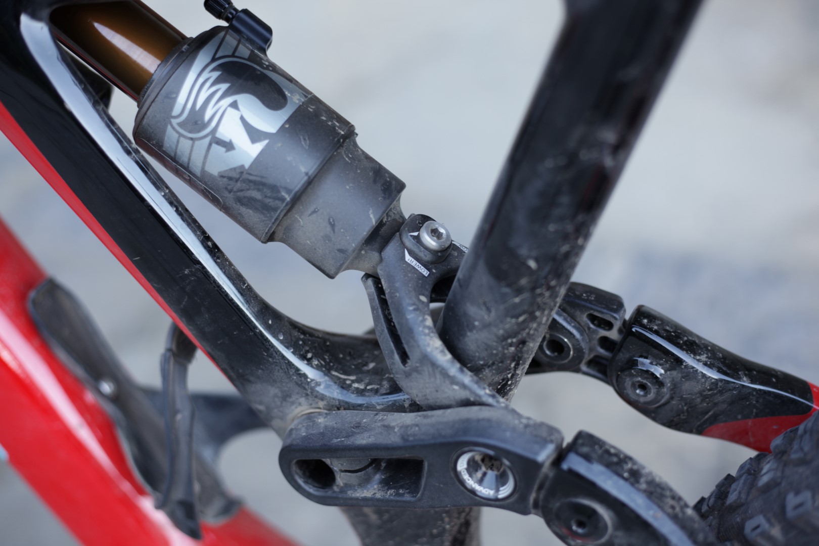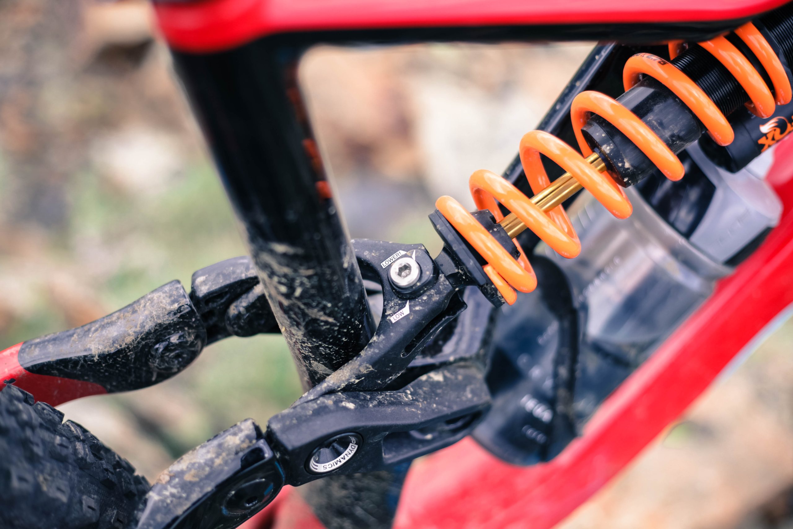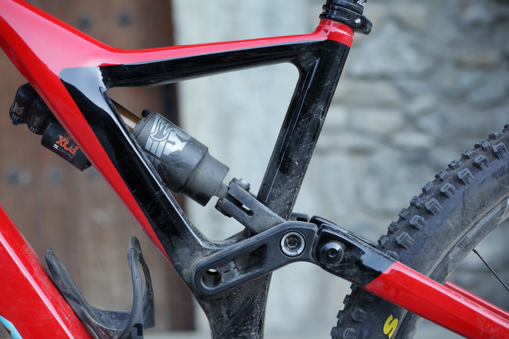 The new frame for 2018 now has a full carbon construction from a one piece mould. The single-sided frame design uses an offset damper for ease of removal and adjustment. This is matched up with an offset water bottle for access purposes.