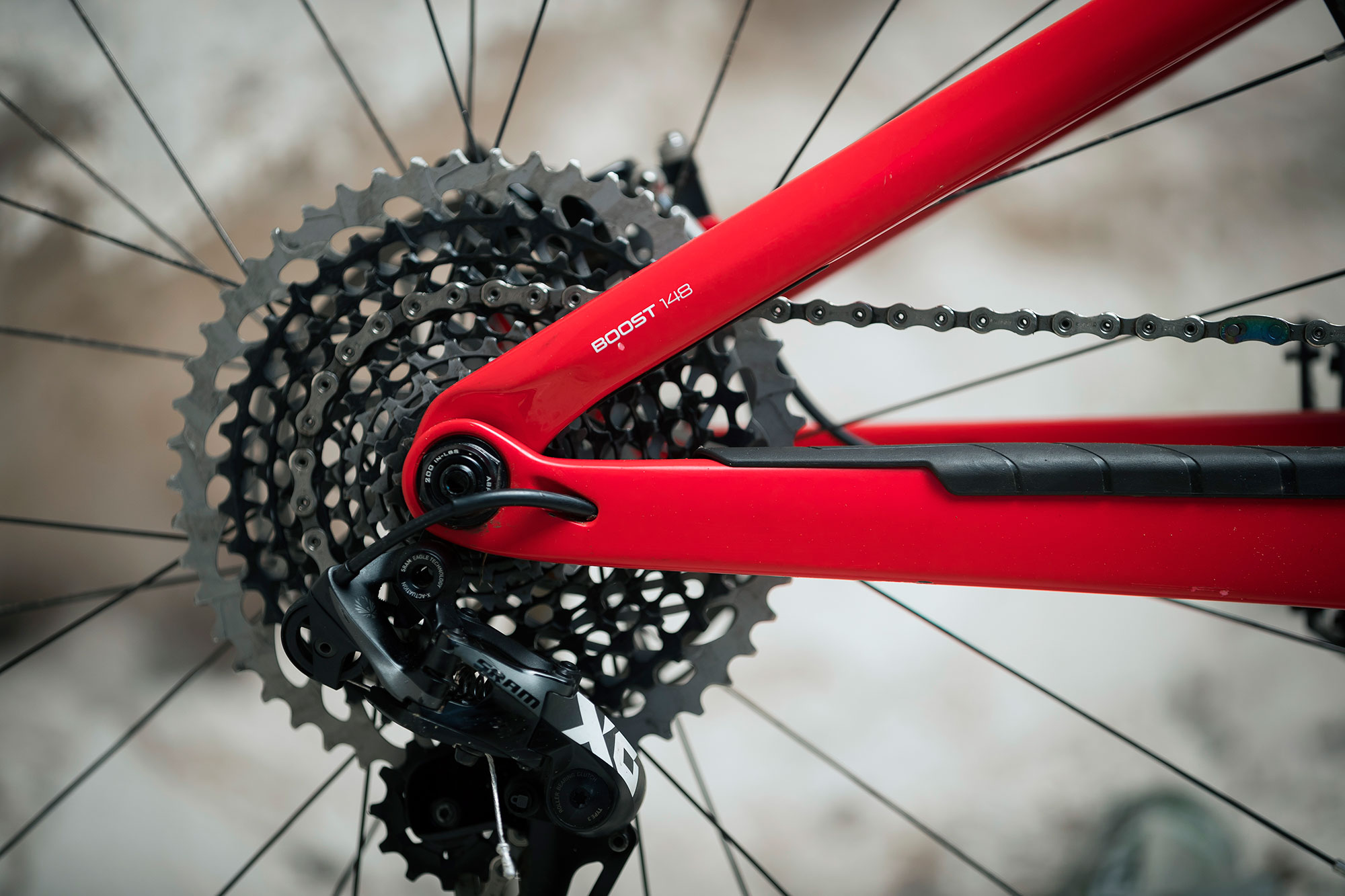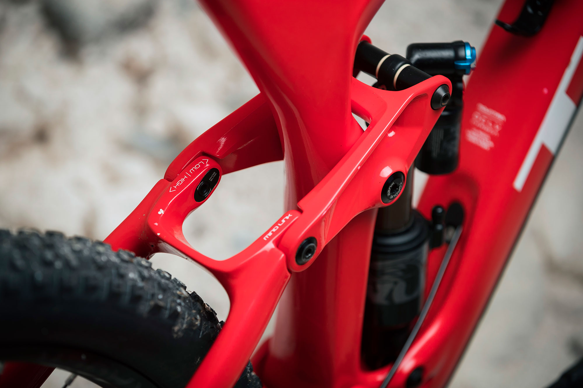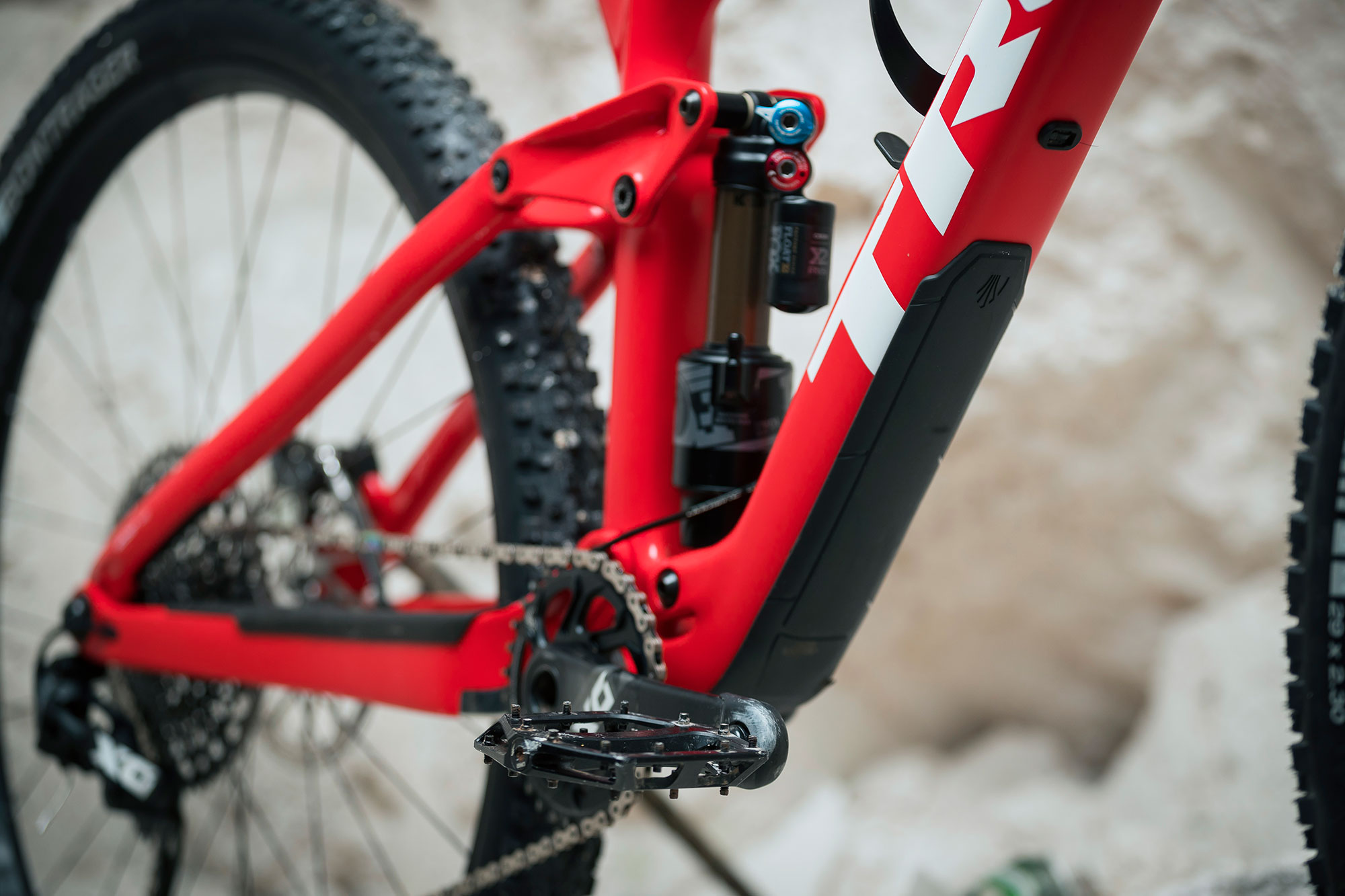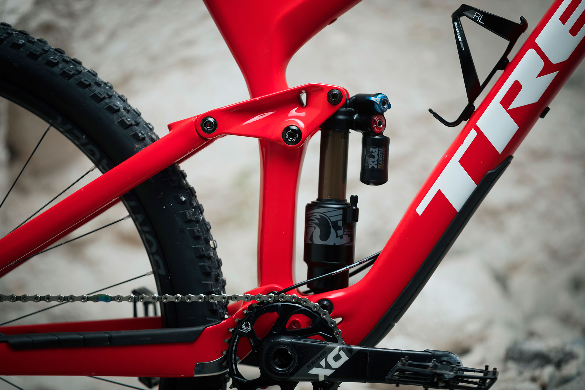 There is enough clearance here for a 2.6” tyre (keep an eye out for that size to take off over the next 12 months) but Trek don’t reckon that Plus tyres will fit (why you would want to is beyond us anyway). Also not permitted are multiple front chainrings, the Slash is 1x only to keep the chainstays short and optimise stiffness and weight.