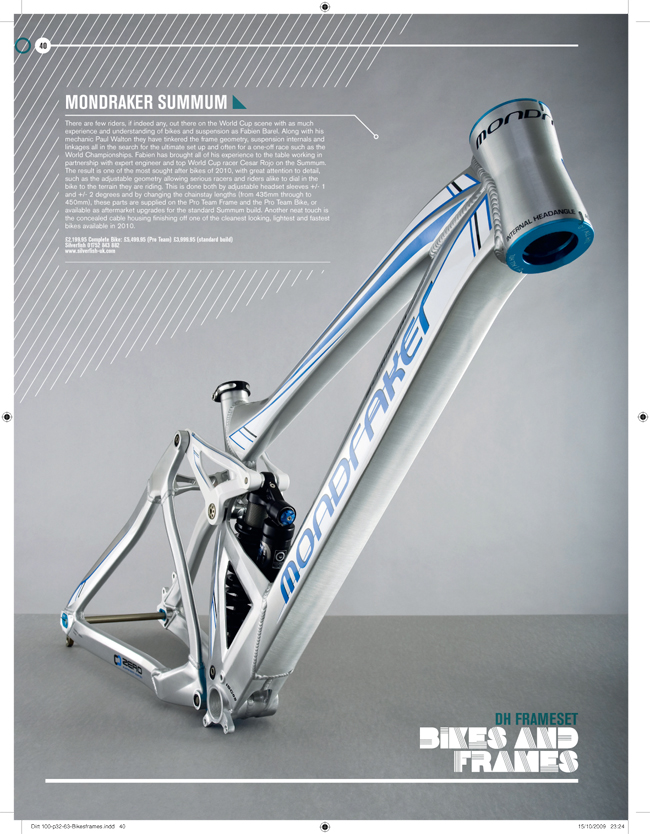 The result is one of the most sought after bikes of 2010, with great attention to detail, such as the adjustable geometry allowing serious racers and riders alike to dial in the bike to the terrain they are riding. This is done both by adjustable headset sleeves +/- 1 and +/- 2 degrees and by changing the chainstay lengths (from 435mm through to 450mm), these parts are supplied on the Pro Team Frame and the Pro Team Bike, or available as aftermarket upgrades for the standard Summum build. Another neat touch is theconcealed cable housing finishing off one of the cleanest looking, lightest and fastest bikes available in 2010.