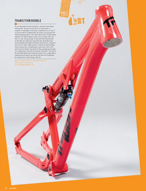 For us riding bikes means having fun, and this frame knows nothing else. Yes you can race 4X on it if you want, or compete in slopestyle or dirt jump competitions on it, but if it’s best suited to anything then we reckon it’s just good old fashioned pissing about. Isn’t that what most of us like doing anyway?