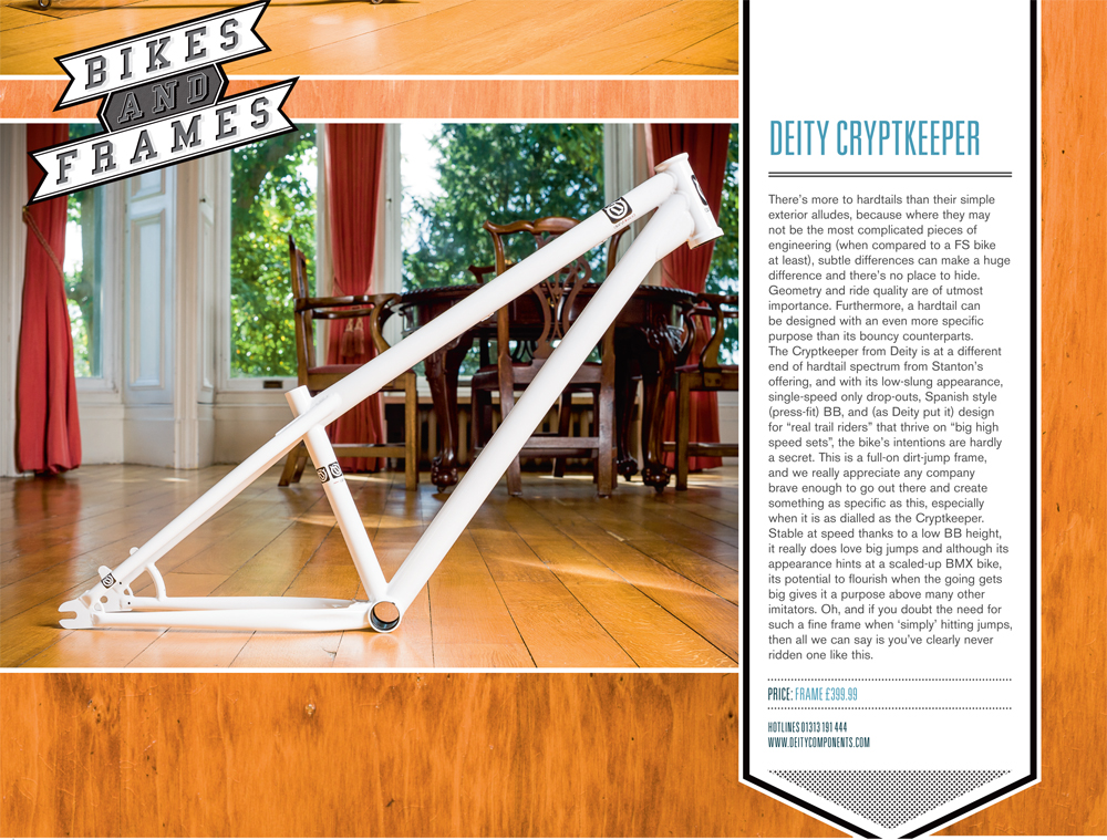 The Cryptkeeper from Deity is at a different end of hardtail spectrum from Stanton’s offering, and with its low-slung appearance, single-speed only drop-outs, Spanish style (press-fit) BB, and (as Deity put it) design for “real trail riders” that thrive on “big high speed sets”, the bike’s intentions are hardly a secret. This is a full-on dirt-jump frame, and we really appreciate any company brave enough to go out there and create something as specific as this, especially when it is as dialled as the Cryptkeeper. Stable at speed thanks to a low BB height, it really does love big jumps and although its appearance hints at a scaled-up BMX bike, its potential to flourish when the going gets big gives it a purpose above many other imitators.