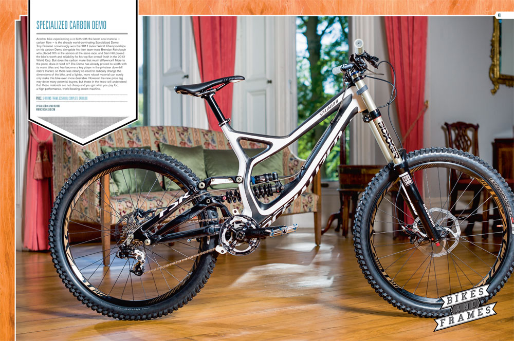 Another bike experiencing a re-birth with the latest cool material – carbon fibre – is the already world-dominating Specialized Demo. Troy Brosnan convincingly won the 2011 Junior World Championships on his carbon Demo alongside his then team-mate Brendan Fairclough who placed fifth in the seniors at the same race, and Sam Hill proved the bike’s worth and reliability for his top five overall finish in the 2012 World Cup.