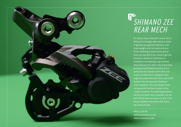 For those of you that don’t know, Zee is Shimano’s cheaper alternative to Saint. In general you get less features, a bit more weight, and not quite as fine a finish. Nothing to write home about I hear you say. Well if you haven’t got the money to stretch to Saint then it probably is something to get excited about because it’s still a very impressive groupset, but if there’s one bit of it in particular that stands out it’s this rear mech. It’s Shimano’s cheapest short cage mountain bike rear mech, yet it still features the all important Shadow+ chain stabilizer. The only thing it lacks compared to the Saint version is the ‘mode converter’ for switching between narrow and wide ratio cassettes, but we don’t think that’s an issue. For any 1×10 setup, whether it be trail or DH, this is the smart choice.